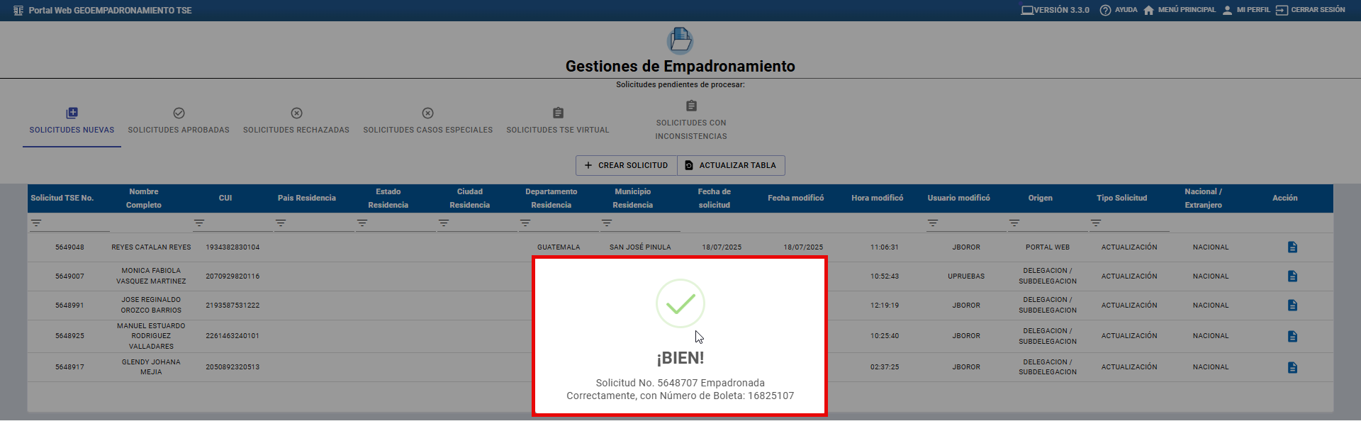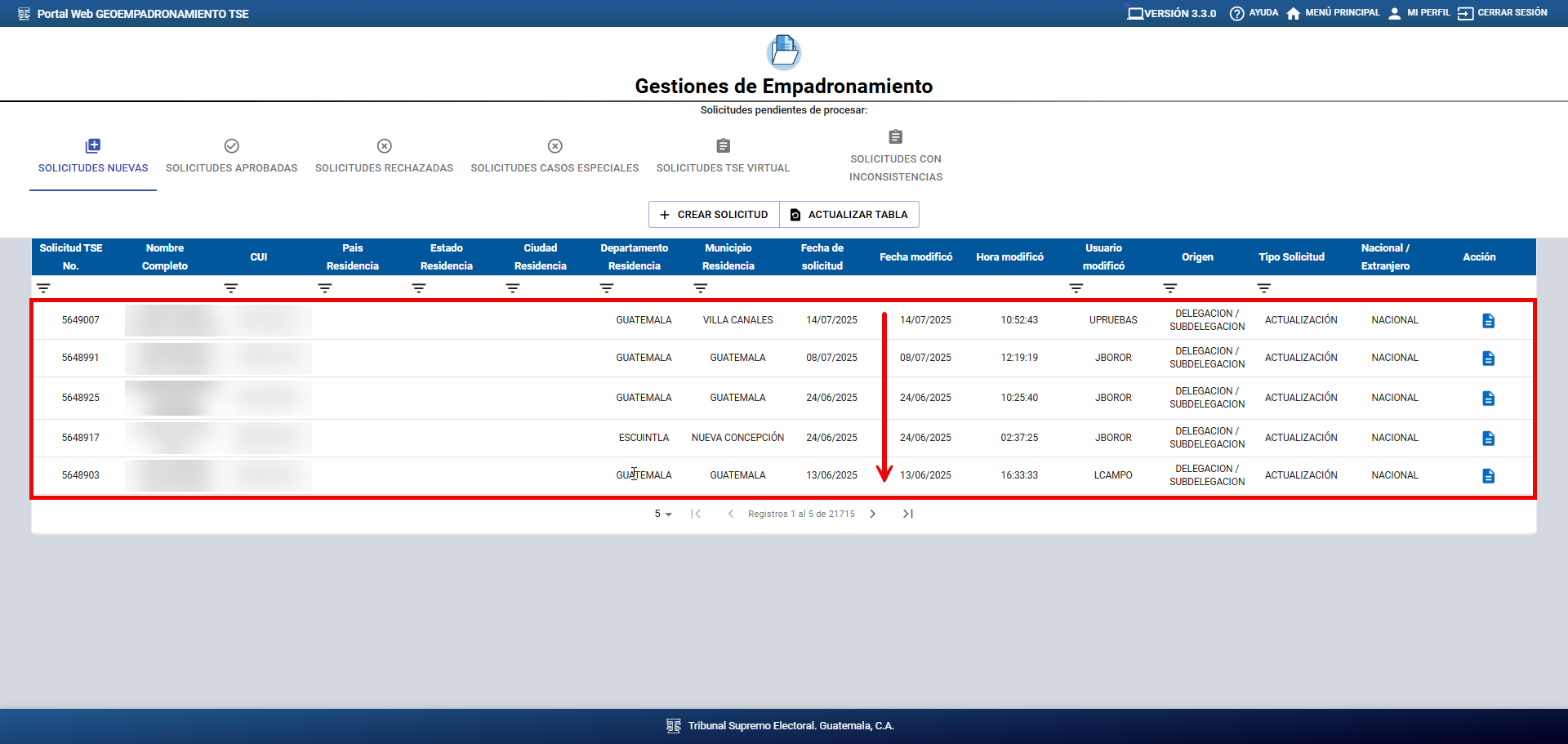 Después de hacer clic en el botón “Actualizar tabla”, el sistema le mostrará el listado de solicitudes pendientes de gestionar.