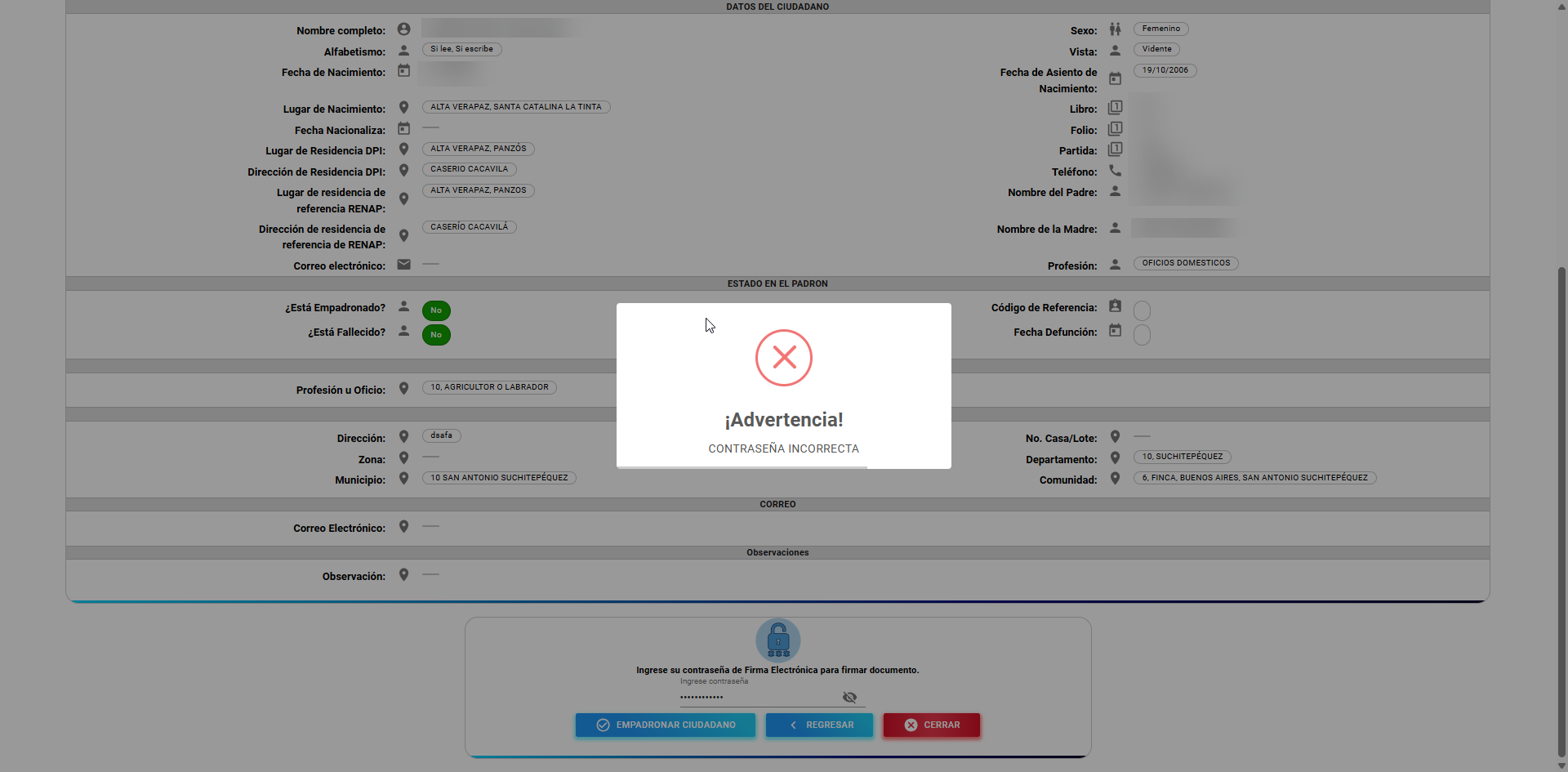 Una vez ingresada la contraseña, debe hacer clic en el botón “Empadronar Ciudadano”.