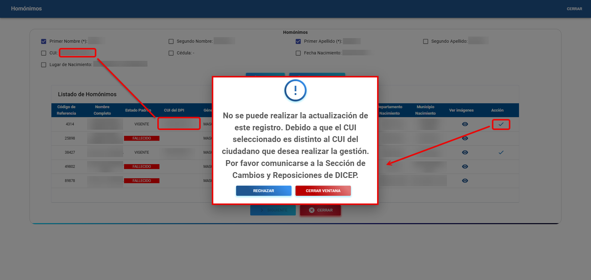 Si el empadronador intenta seleccionar un registro retornado como homónimo cuyo CUI es diferente al del ciudadano que está realizando la gestión, el sistema mostrará un mensaje indicando que no es posible completar la acción.