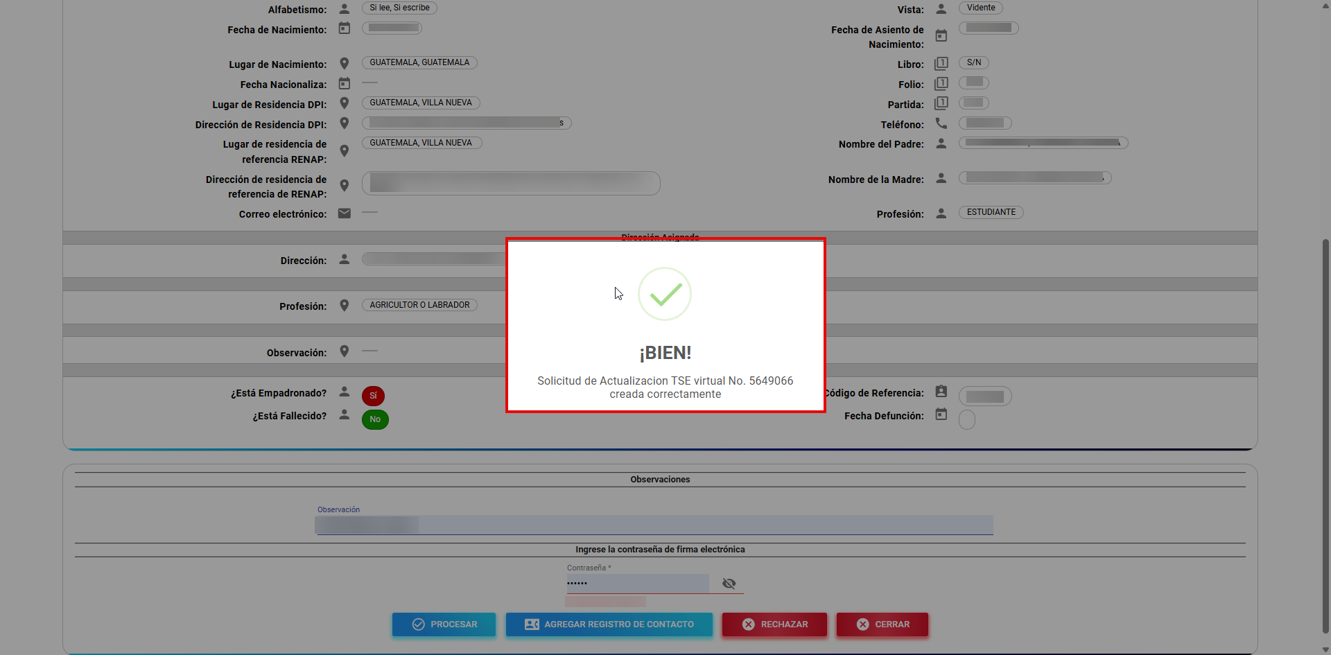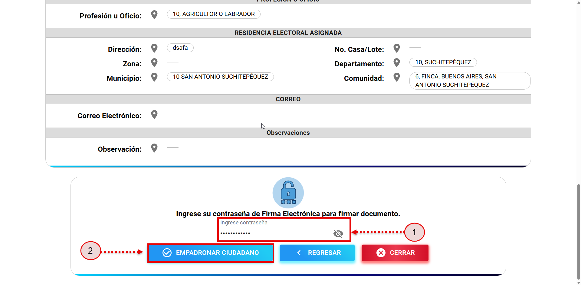 Si el empadronador verifica y todo está bien, continua con el registro de la contraseña de firma electrónica.