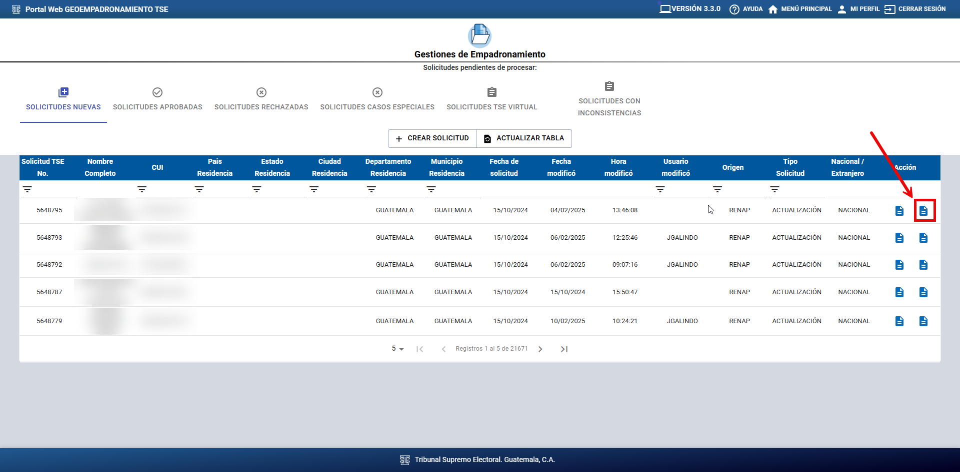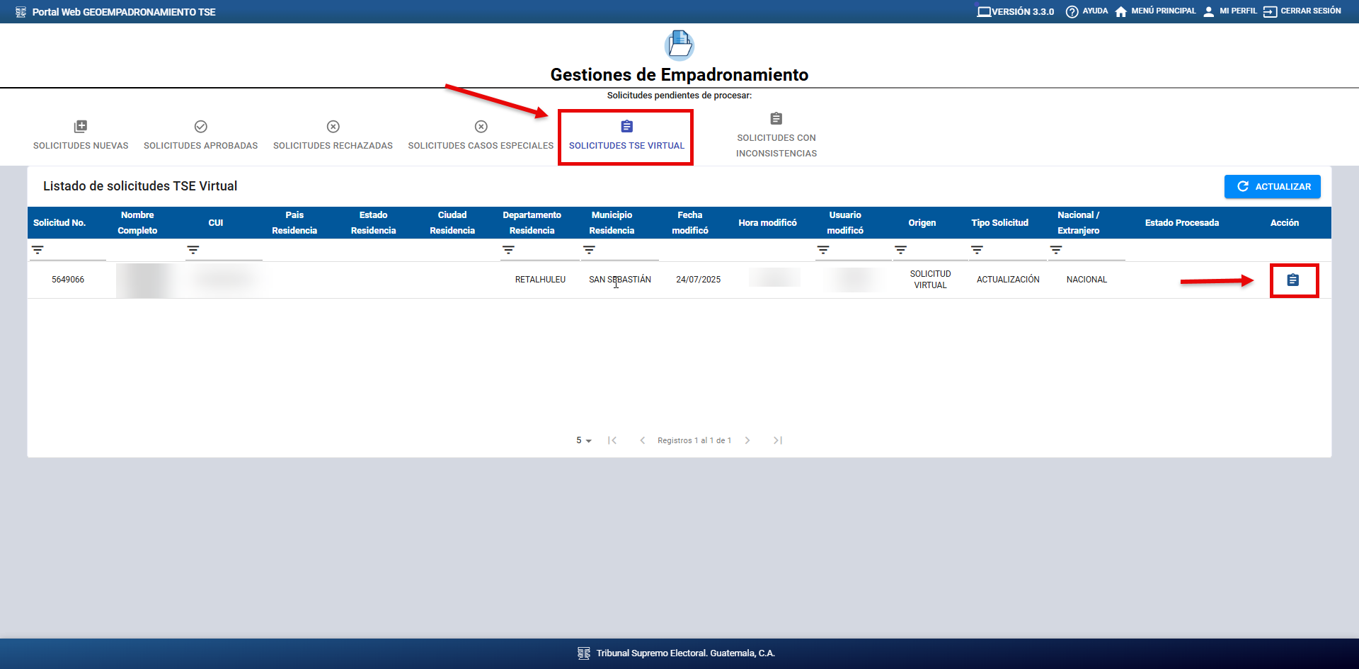 Una vez identificada la solicitud a procesar, haga clic en el ícono del campo “Acción”, como se muestra en la imagen siguiente, para continuar con el procesamiento.