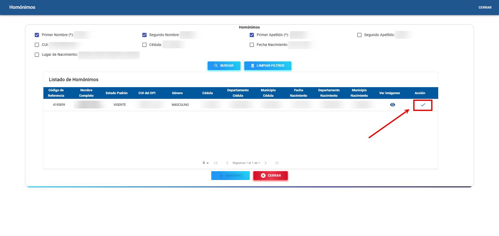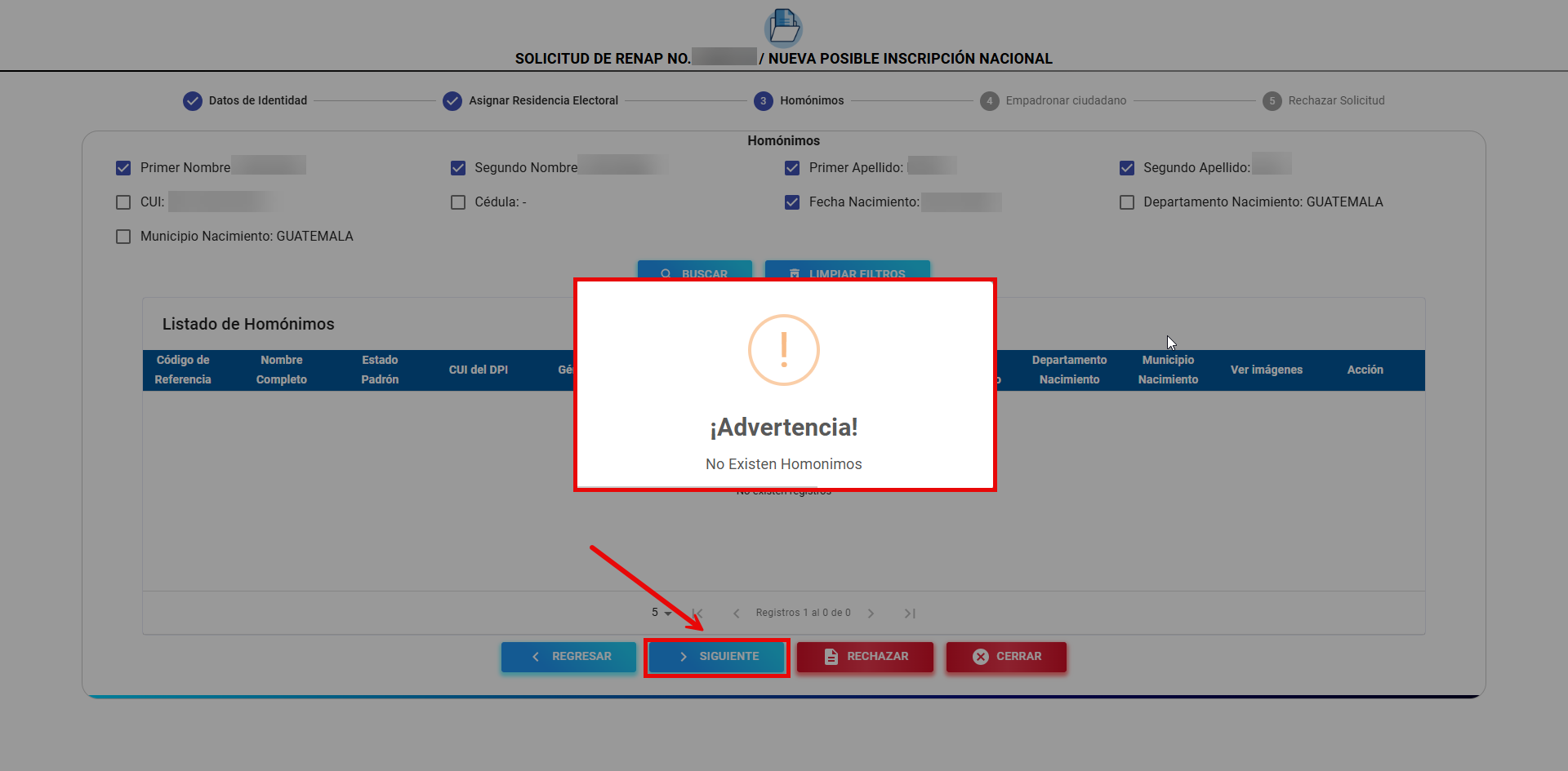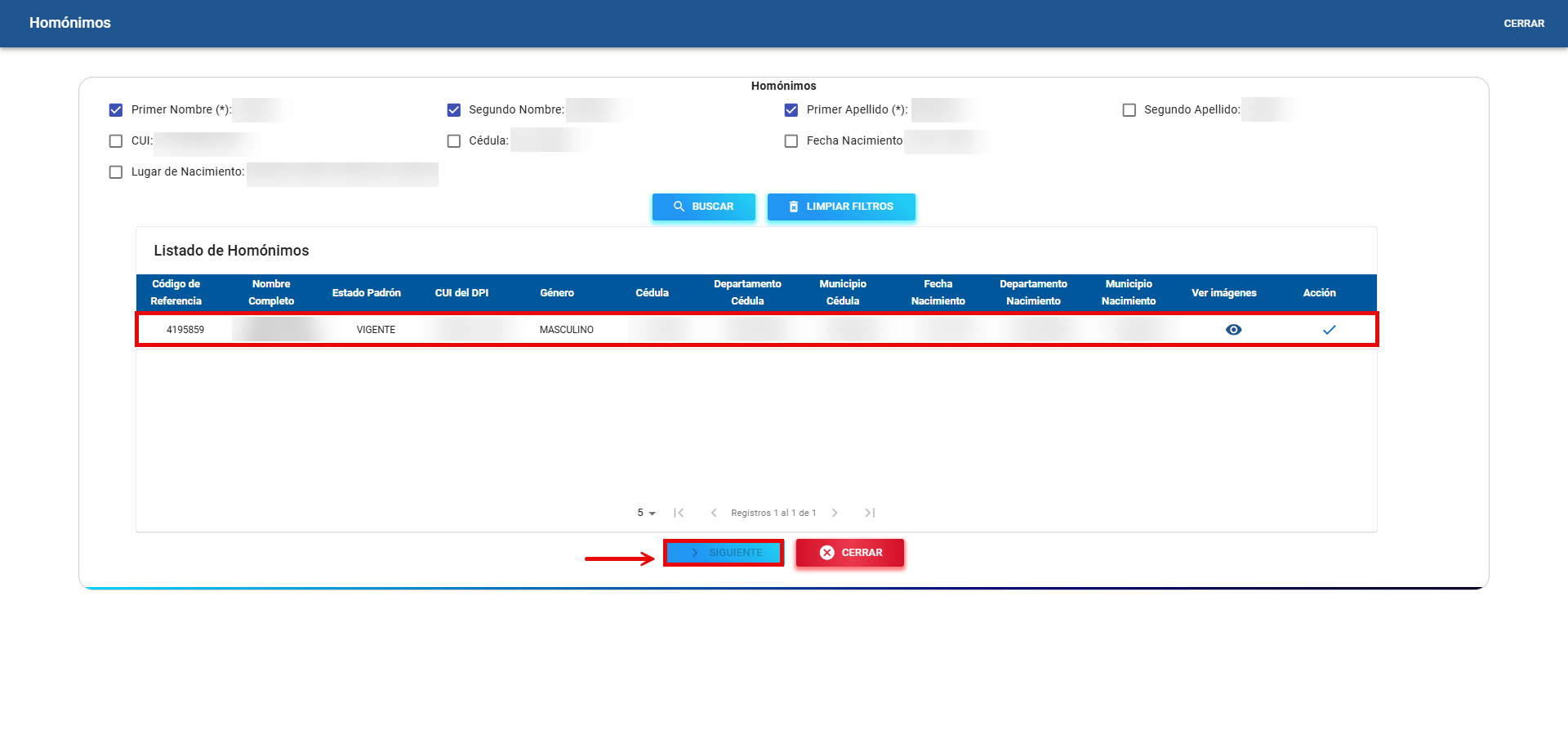 En este escenario, el botón "Siguiente" permanece deshabilitado por defecto, con el fin de que el empadronador seleccione manualmente el homónimo que le pertenece al ciudadano antes de continuar con el proceso.