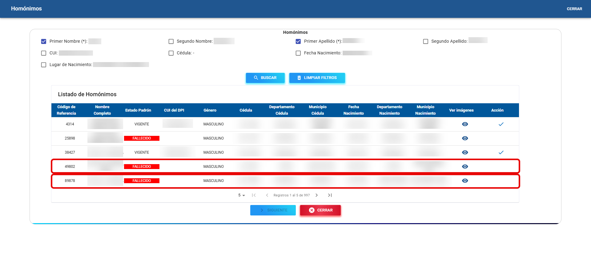 Si en el listado de homónimos retornados por el sistema, se visualizan registros cuyo estado en el padrón es distinto a alguno de los siguientes: