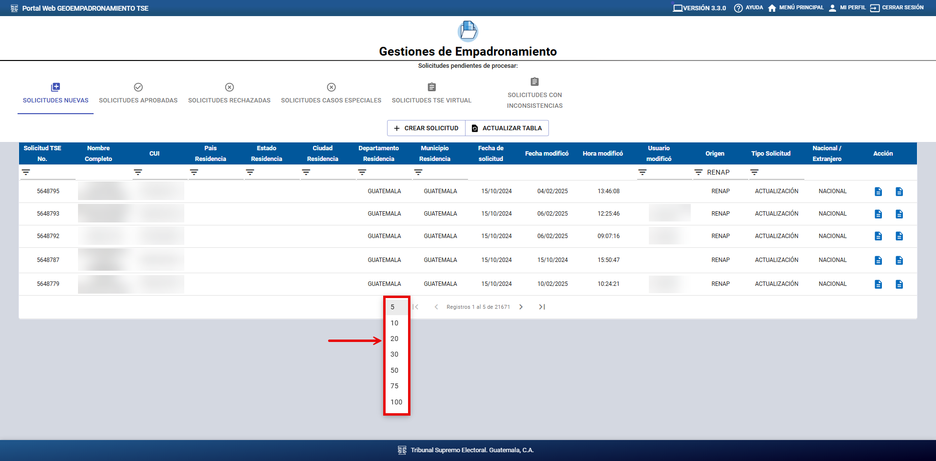 b. Por defecto, el sistema muestra únicamente 5 registros en la tabla de solicitudes. Si desea visualizar más, puede ampliar la cantidad desde la opción ubicada en la parte inferior de la tabla.