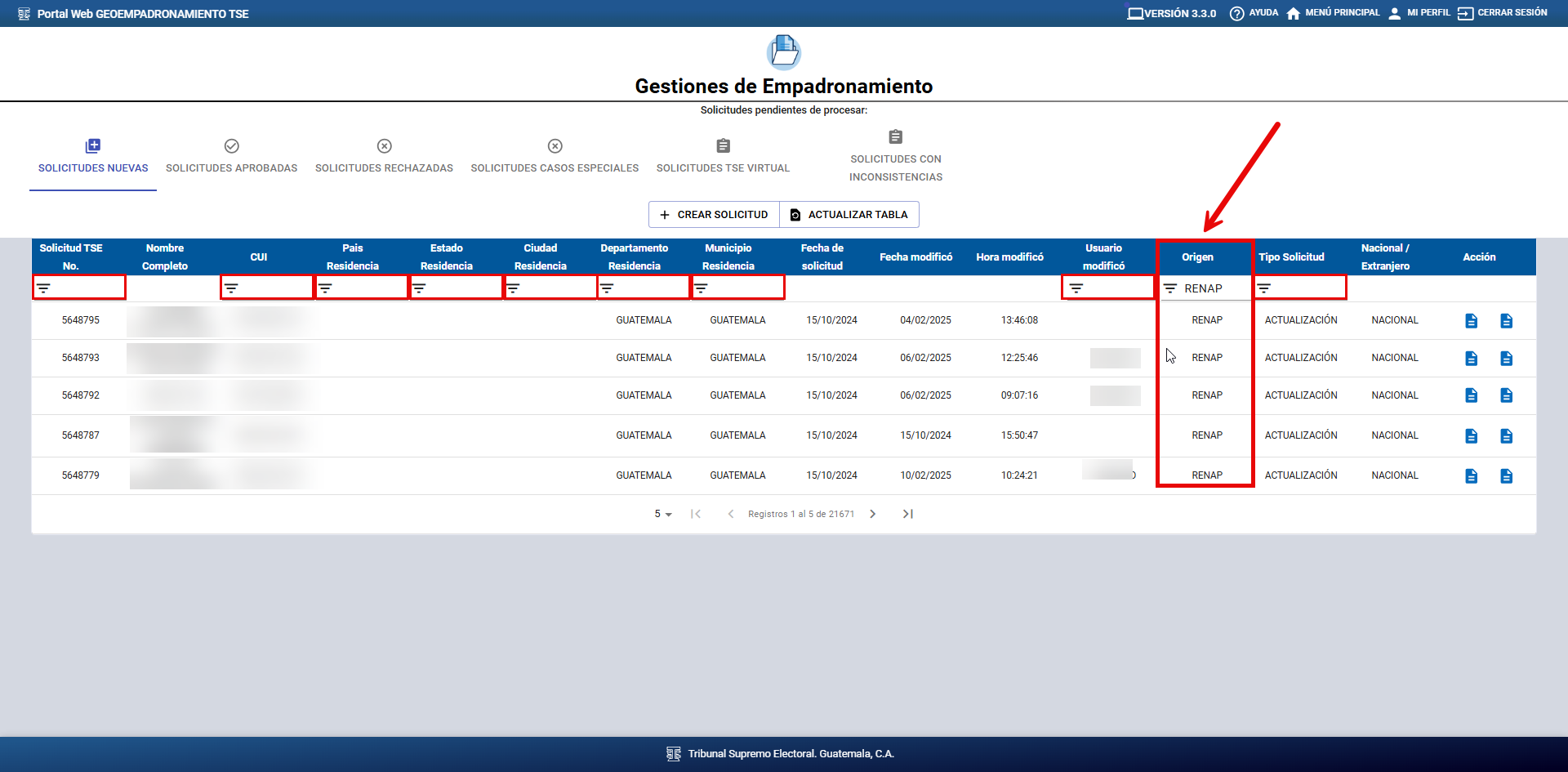 Para filtrar las solicitudes, escriba "RENAP” en el campo de Origen, ubicado dentro de los filtros de la tabla. El sistema mostrará únicamente las solicitudes pendientes de procesar cuyo origen sea de RENAP, las cuales se presentarán en el orden indicado en el paso anterior.