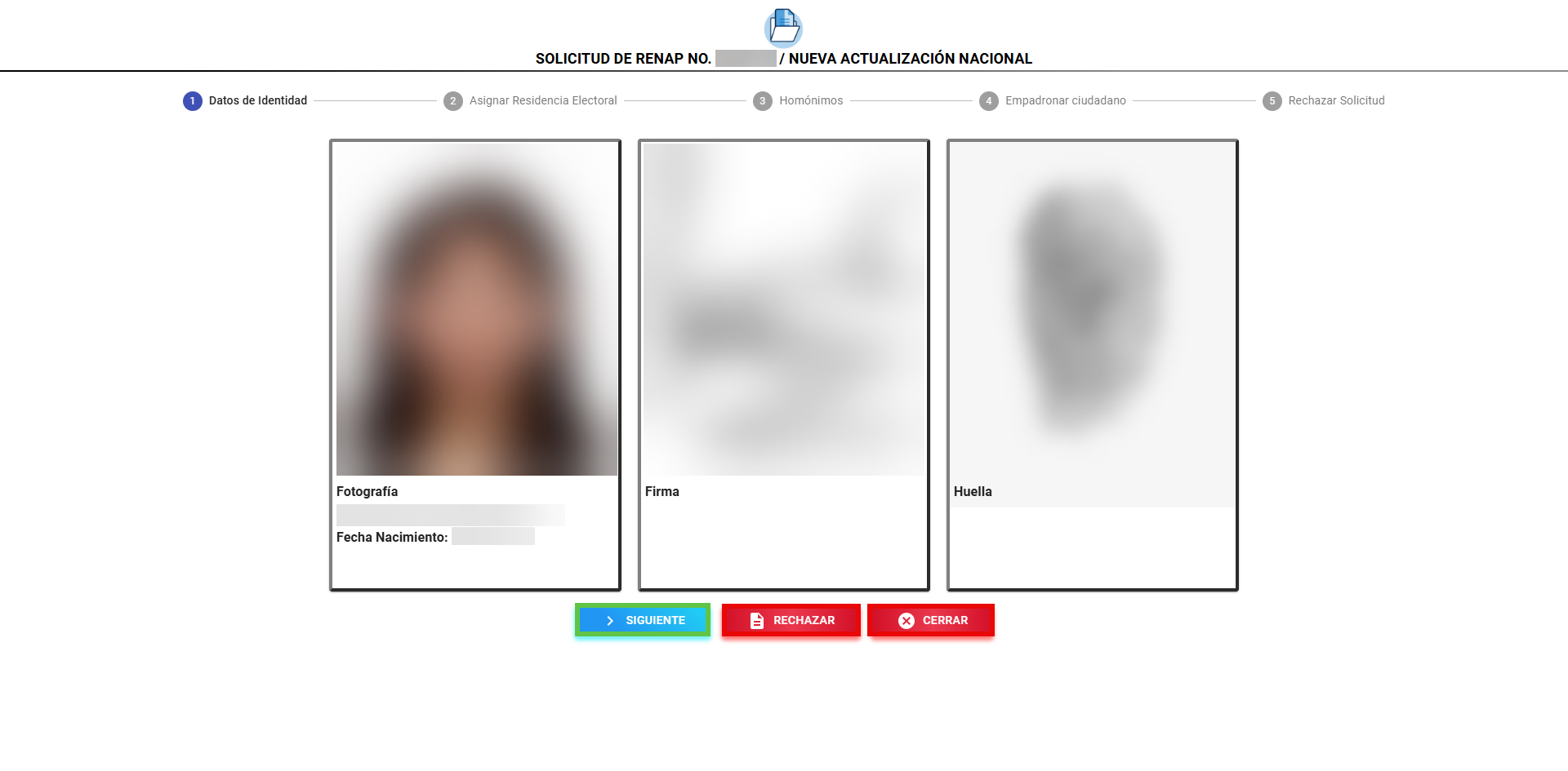 Una vez seleccionado un registro en la bandeja de “Solicitudes pendientes” como Posible Inscripción, el sistema mostrará la pantalla de verificación de identidad. En ella se presentarán las imágenes de: