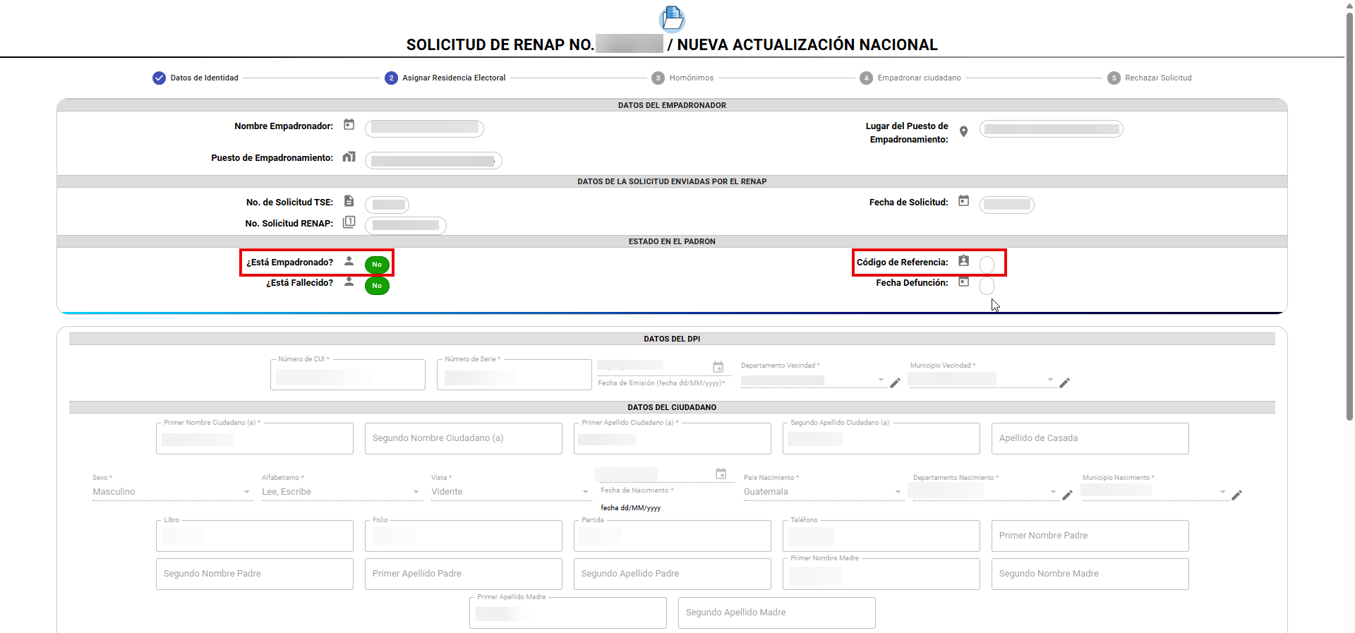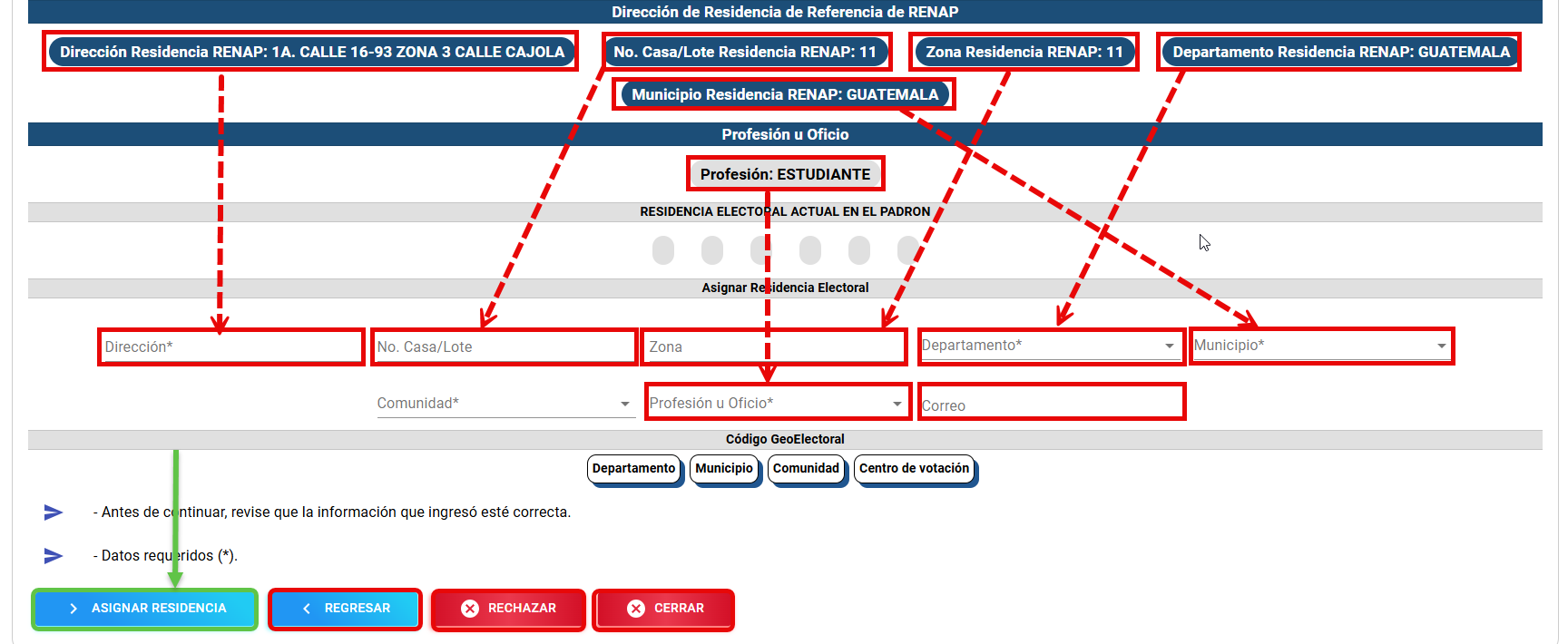 Con base en la información registrada por el ciudadano y enviada por RENAP, la cual se visualiza en la sección “Dirección de Residencia de Referencia de RENAP”, se procede a asignar la residencia electoral desde la sección “Asignar Residencia Electoral”.