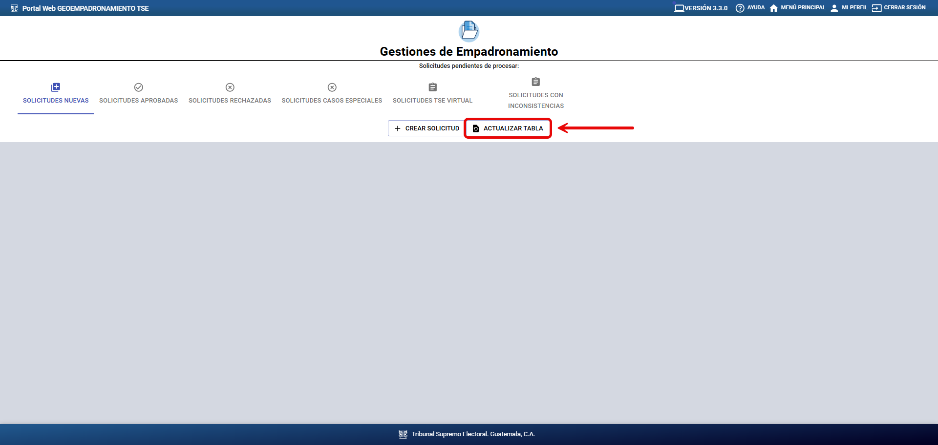 El sistema le mostrará una pantalla donde deberá dar clic al botón “Actualizar tabla” para cargar los registros de las solicitudes pendientes de gestionar.