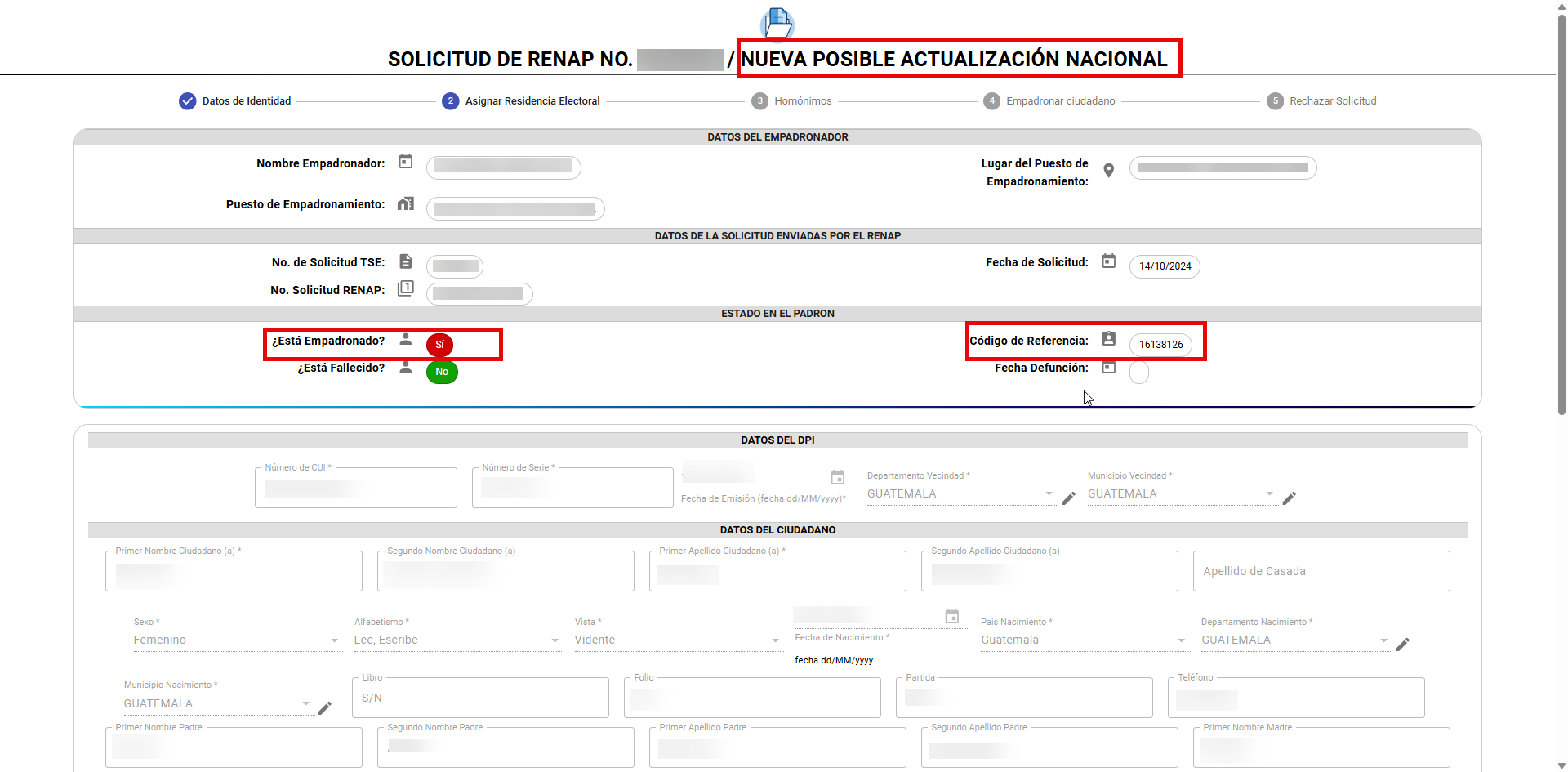 Luego de ver los datos de identidad del ciudadano, y si se trata de una solicitud como Posible Actualización, el sistema le mostrará la pantalla para verificar la información personal del ciudadano y la asignación de la residencia electoral.