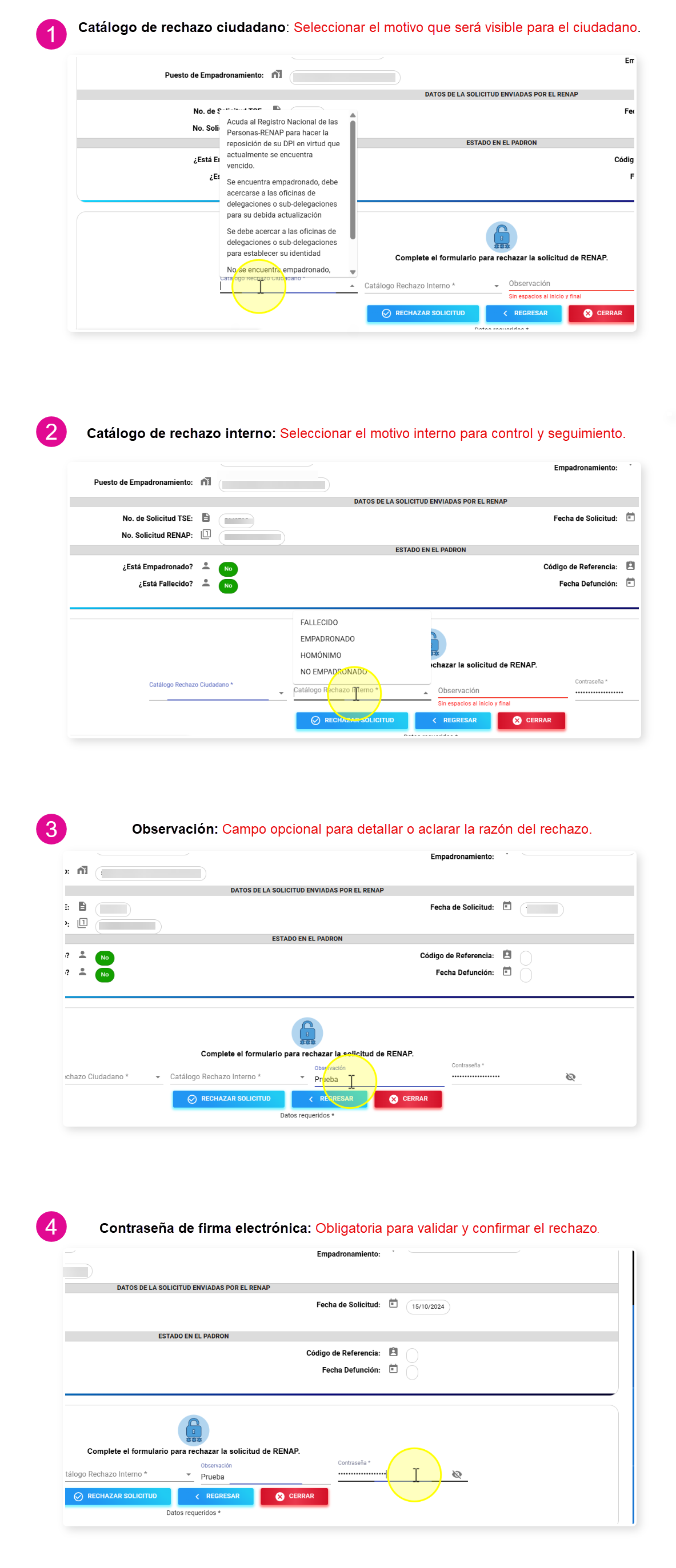 Una vez completados los campos y registrada la contraseña de firma electrónica, se procede a finalizar el rechazo de la solicitud, dando clic al botón “Rechazar Solicitud Portal Web TSE”.