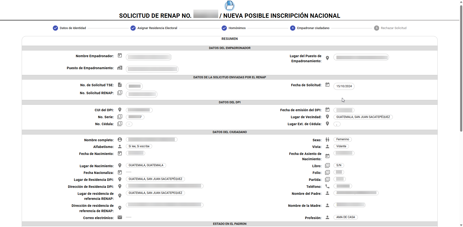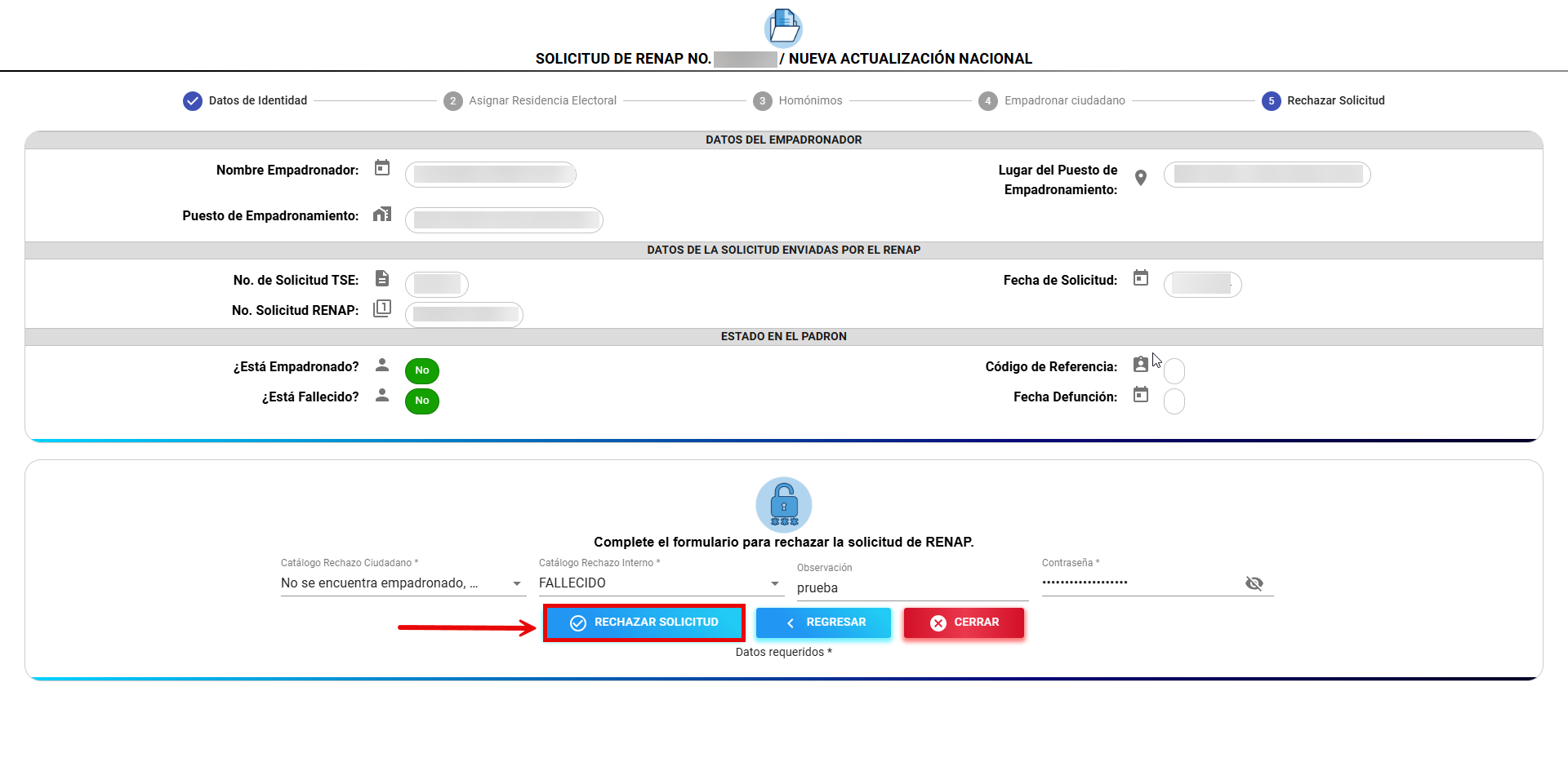 En caso de que la solicitud no pueda ser procesada, el empadronador debe realizar el rechazo desde la pantalla de verificación de información personal del ciudadano.