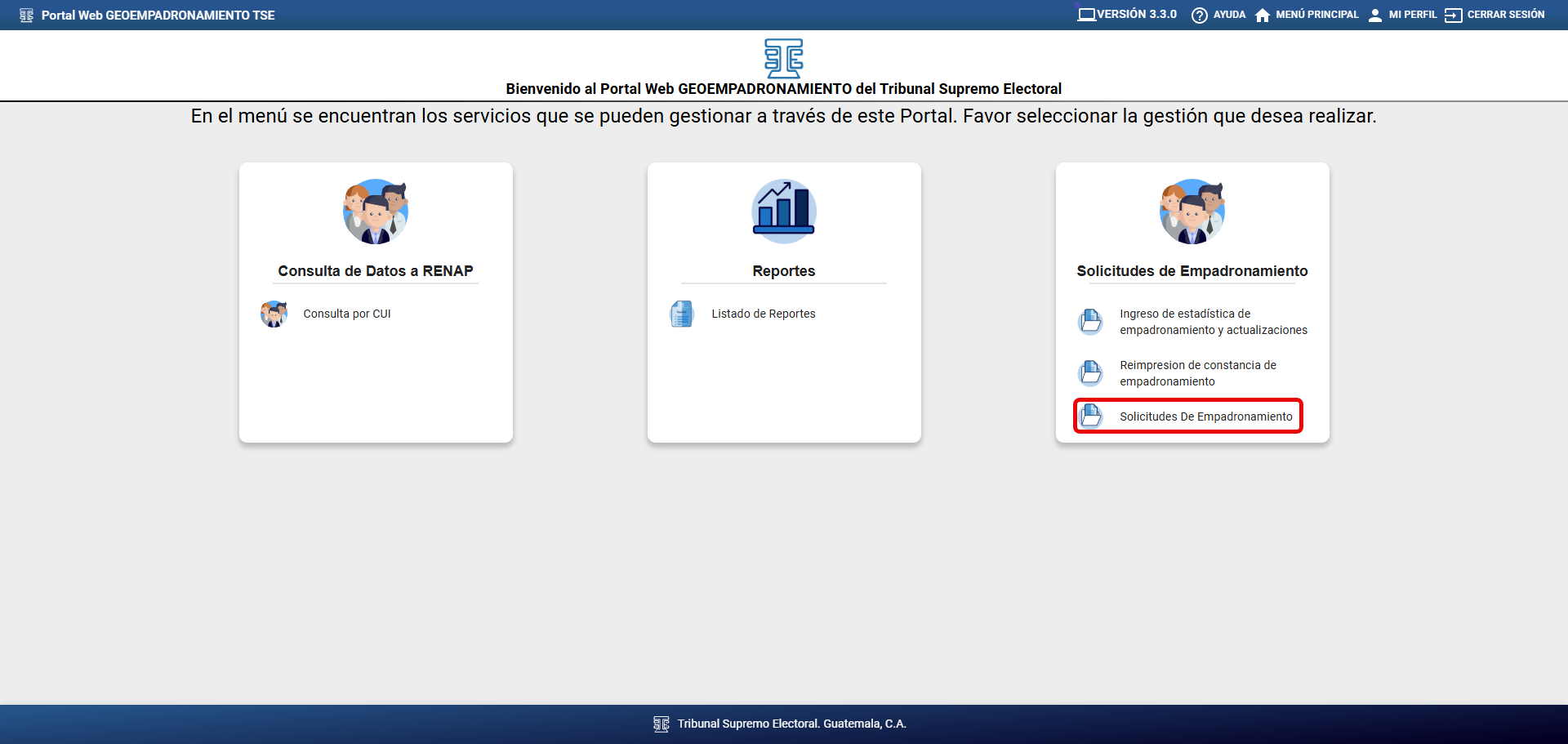El proceso de Gestión de Solicitudes de Empadronamiento o Actualización de solicitudes de origen RENAP, tiene como objetivo ayudar al empadronador a gestionar las solicitudes de Empadronamiento o Actualización generadas con origen RENAP, tanto para territorio nacional como para territorio extranjero.
