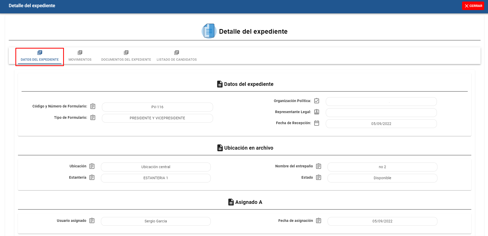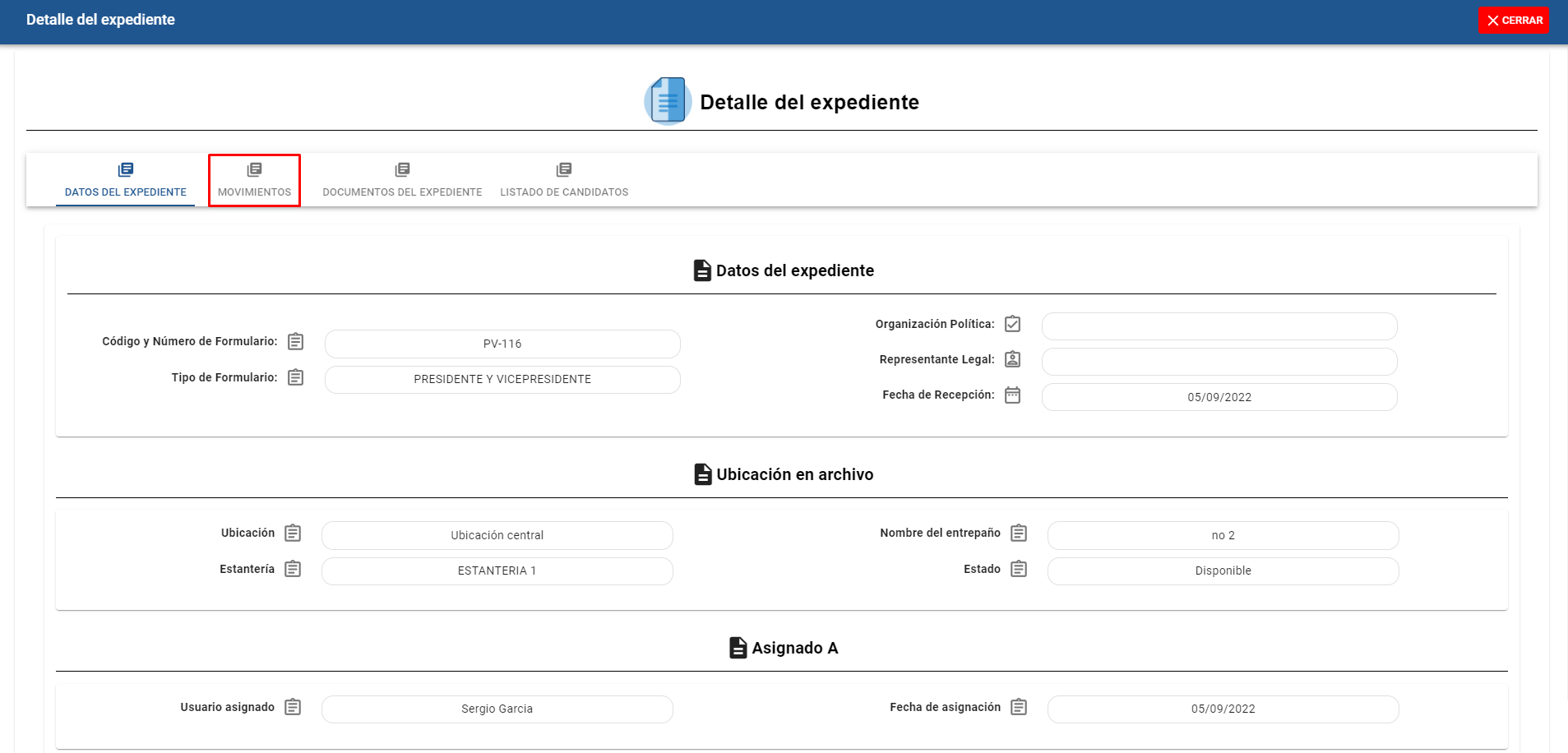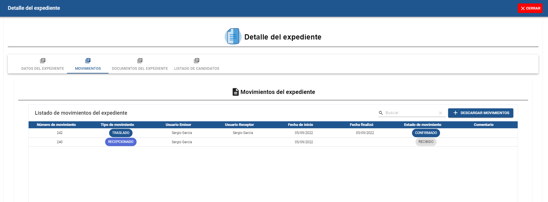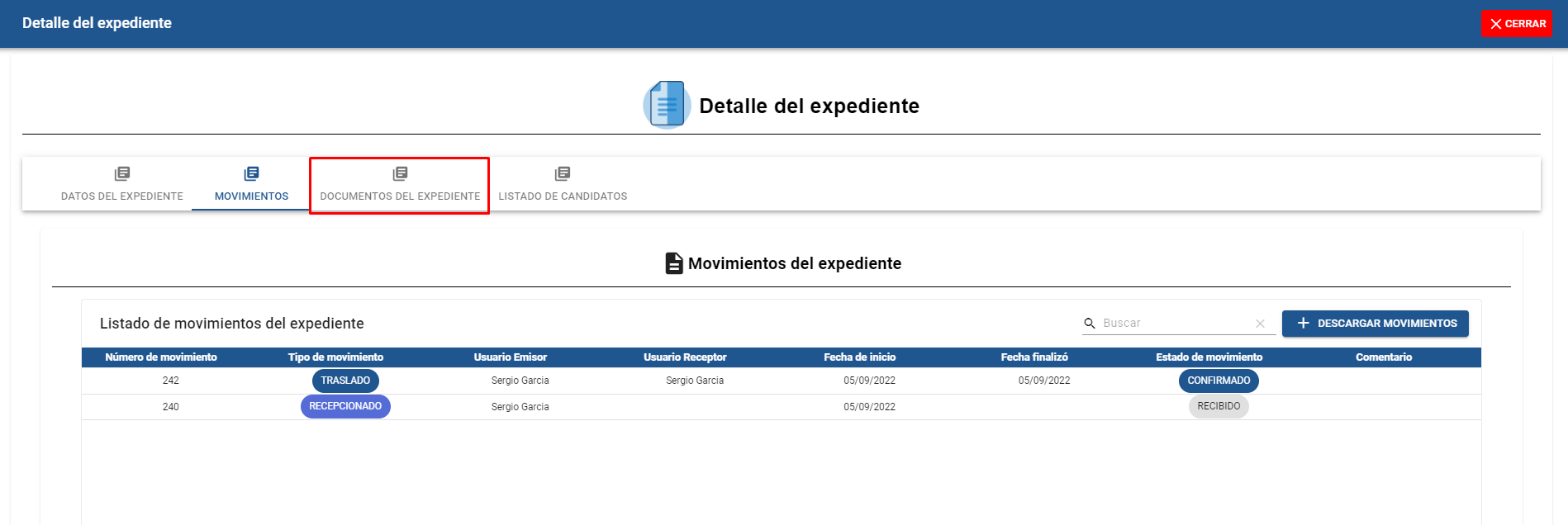 Al dar click a la pestaña nos mostrará el listado de movimientos que el expediente ha tenido.