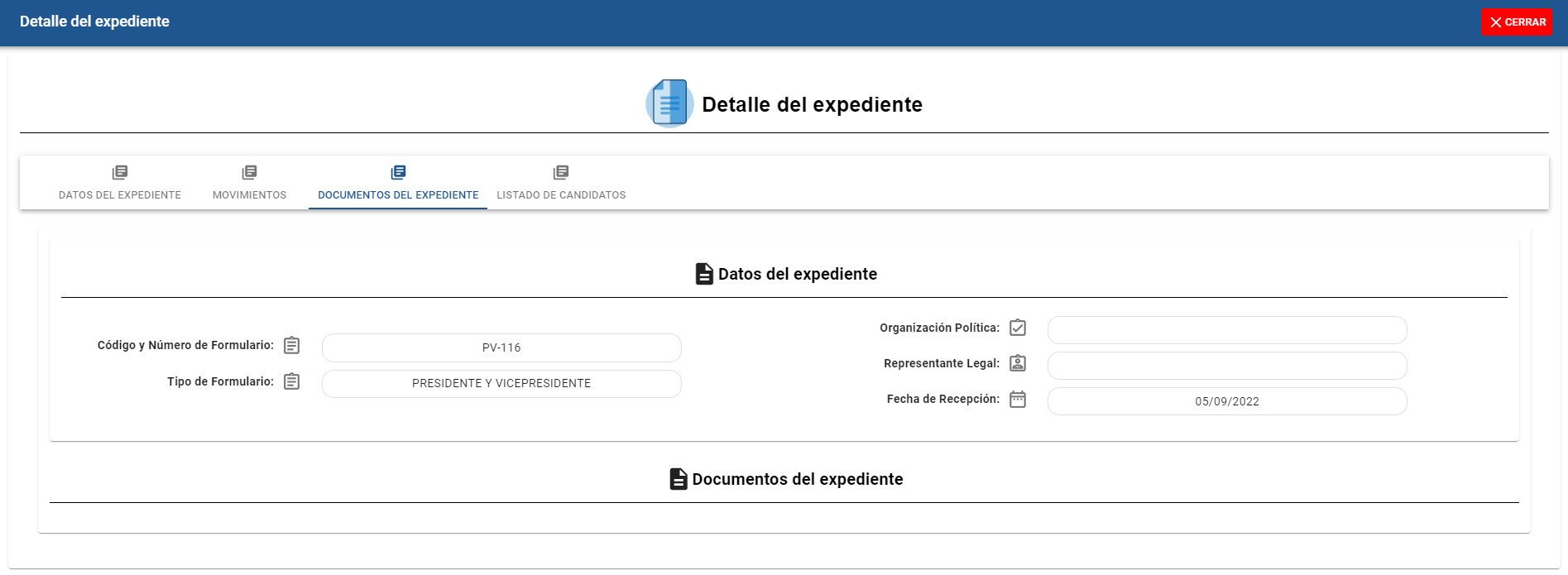 Al dar click en la opción Documentos del expediente, podrá visualizar los documentos adjuntados al expediente.