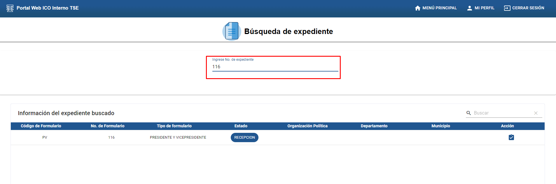Al ingresar al módulo Buscar Expediente visualizará un campo vacío en donde deberá ingresar el número de expediente a buscar y dar Enter.