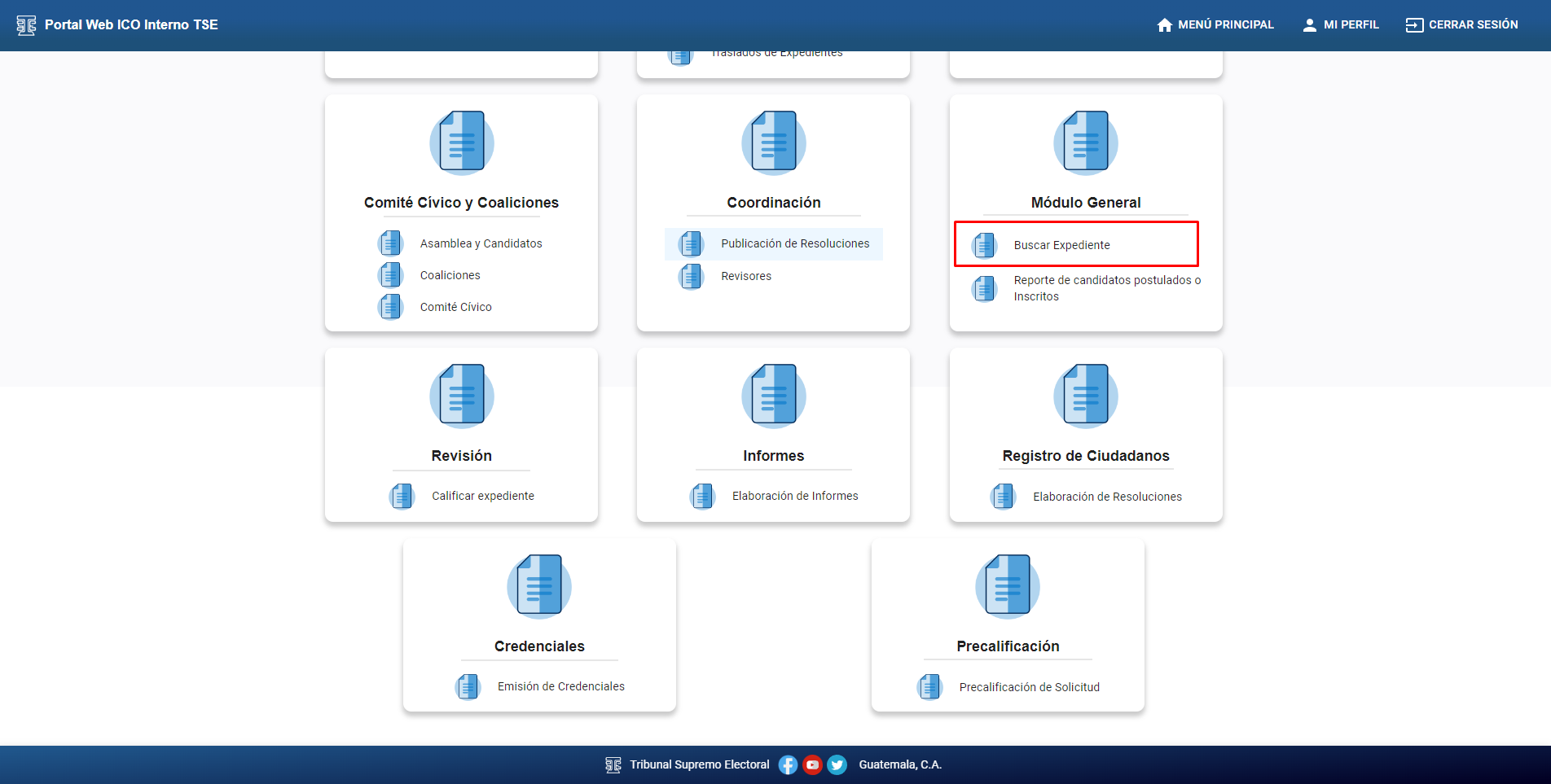 Al ingresar al sistema Portal Web Interno ICO TSE dependiendo de los permisos otorgados a su usuario tendrá acceso a diferentes módulos entre ellos el de Módulo General.