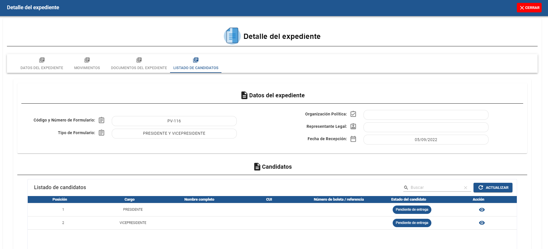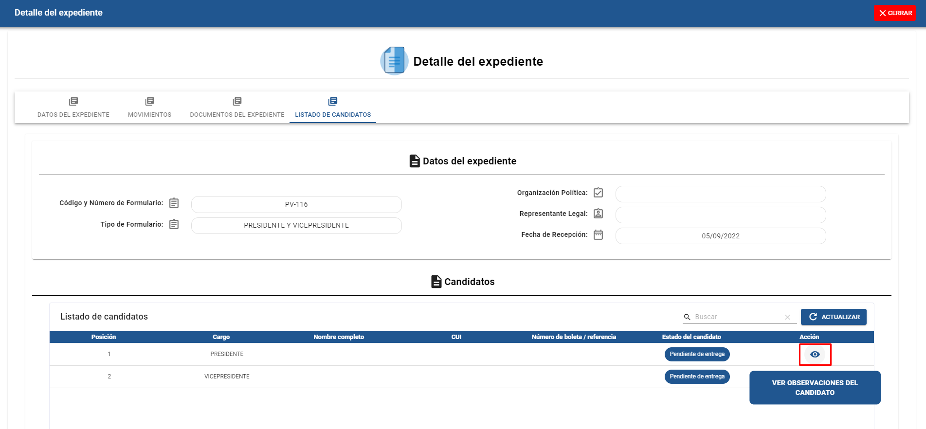 Al dar click en la opción Listado de Candidatos, podrá visualizar los candidatos postulados en el expediente.