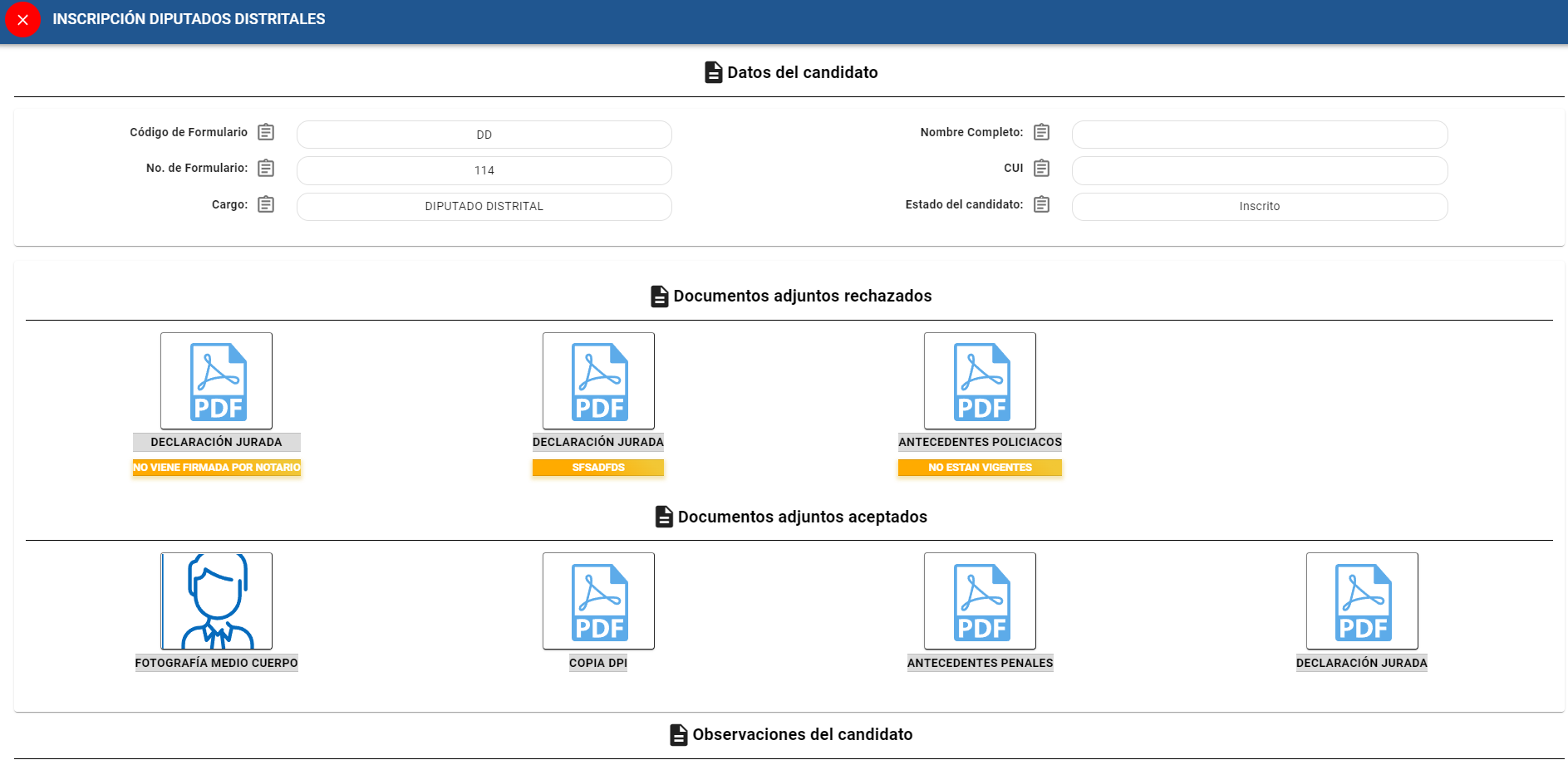 Para poder ver las observaciones de los candidatos deberá de dar click a la acción denominada Ver Observaciones del Candidato.