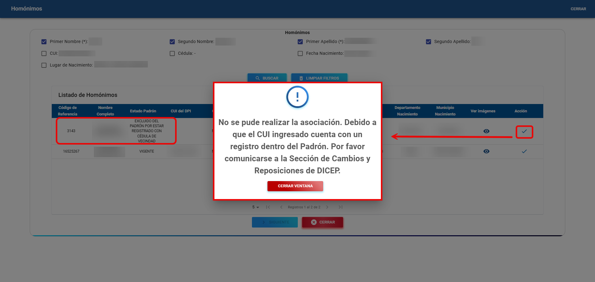Si el empadronador intenta seleccionar un registro retornado como homónimo cuyo CUI es diferente al del ciudadano que está realizando la gestión, el sistema mostrará un mensaje indicando que no es posible completar la acción.