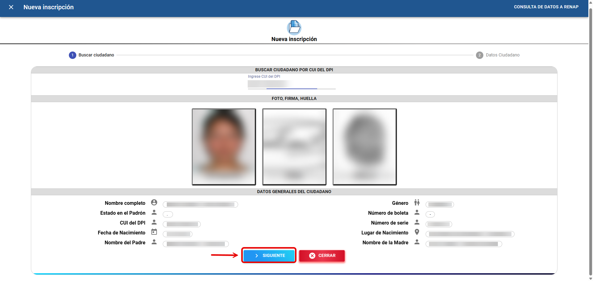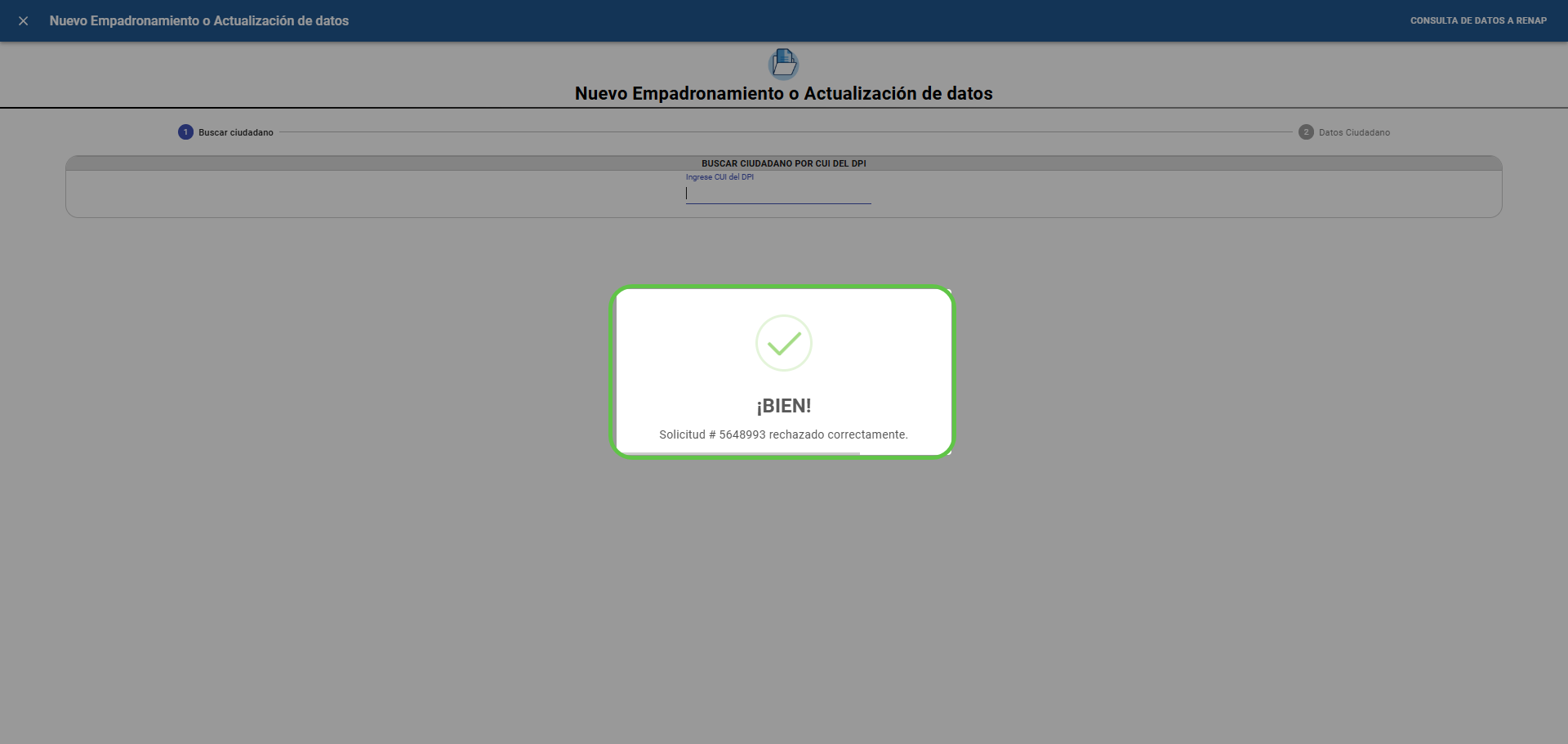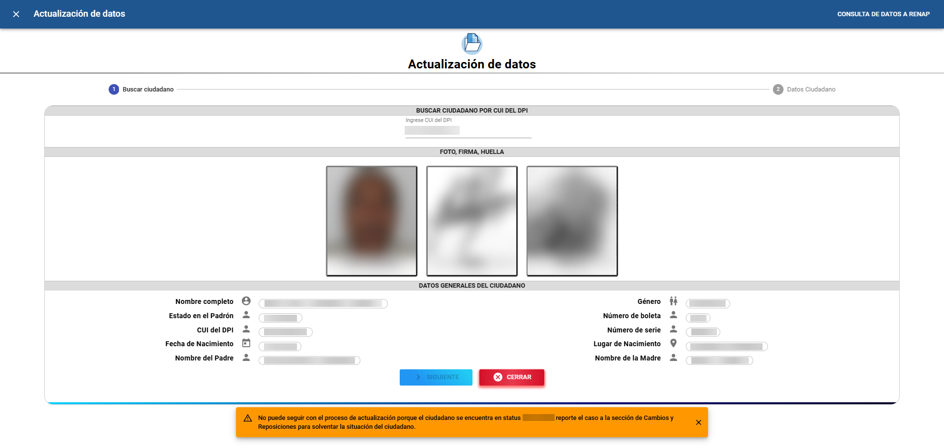 NOTA : El sistema cuenta con validaciones que permiten identificar cuando un ciudadano no está apto para la creación de una solicitud de empadronamiento. Estas validaciones se basan en la información enviada por RENAP y, en caso de que el ciudadano ya esté empadronado, en los datos registrados en el Padrón Electoral. Si el ciudadano no cumple con los criterios establecidos, el sistema mostrará un mensaje de advertencia y, como resultado, no será posible crear la solicitud de empadronamiento mediante esta modalidad.