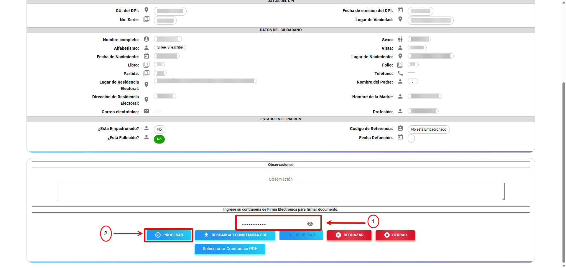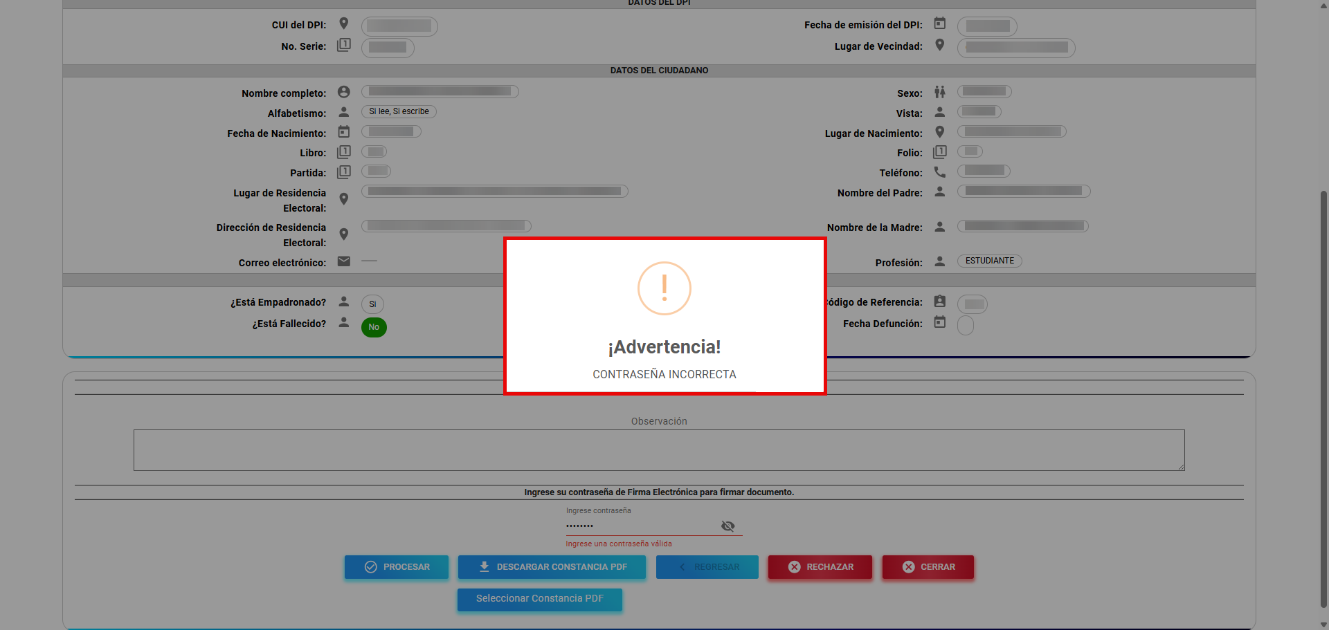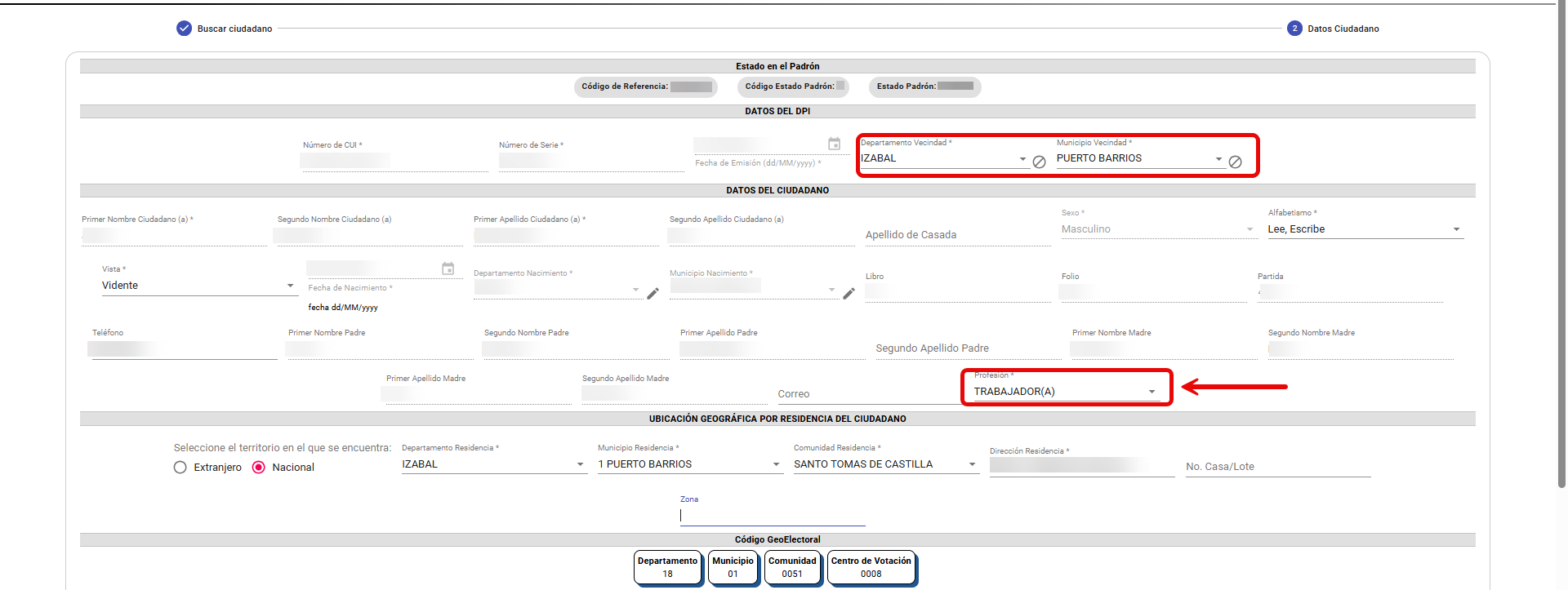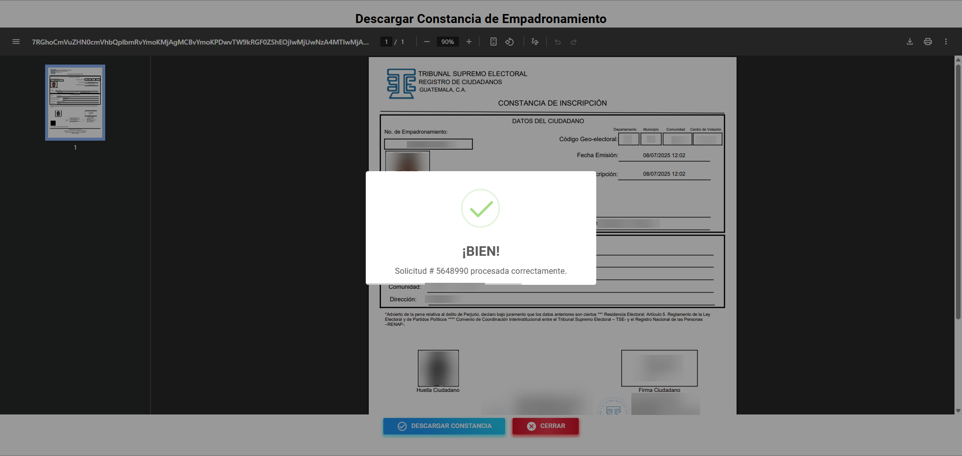 NOTA : El sistema cuenta con validaciones que permiten identificar cuando un ciudadano no está apto para la creación de una solicitud de empadronamiento. Estas validaciones se basan en la información enviada por RENAP y, en caso de que el ciudadano ya esté empadronado, en los datos registrados en el Padrón Electoral. Si el ciudadano no cumple con los criterios establecidos, el sistema mostrará un mensaje de advertencia y, como resultado, no será posible crear la solicitud de empadronamiento mediante esta modalidad.