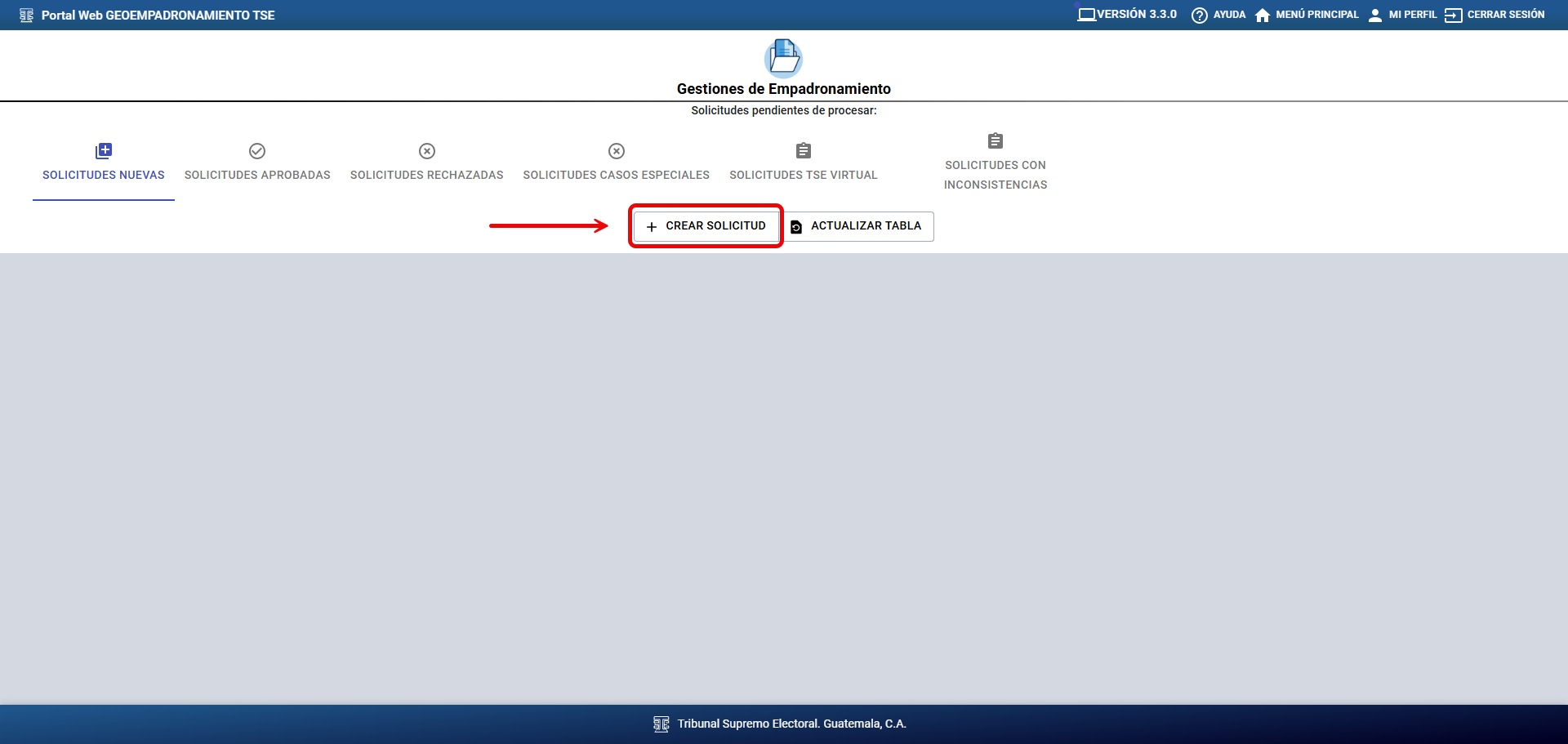 El sistema le mostrará una pantalla donde deberá dar clic al botón “Crear Solicitud”.