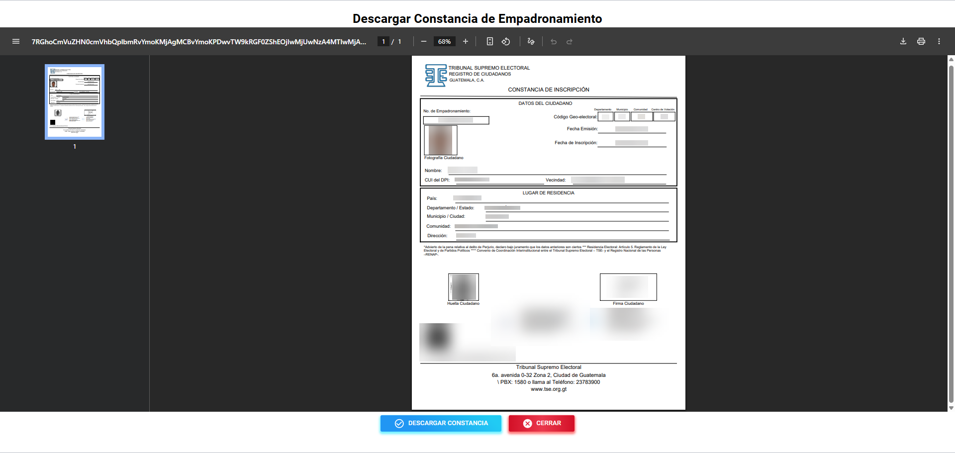 De forma automática, el sistema generará un archivo en formato PDF con la constancia de empadronamiento (inscripción o actualización), en la cual se mostrarán los datos del ciudadano, incluyendo: