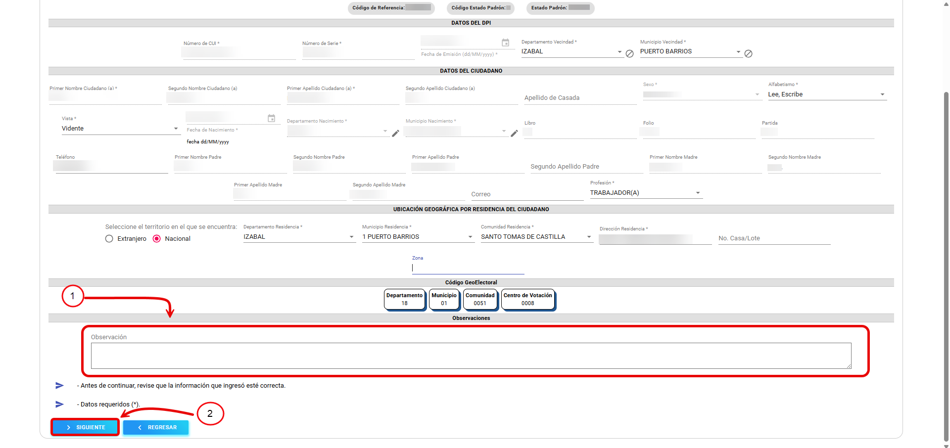 Para finalizar con la solicitud, el empadronador puede, si lo considera necesario, registrar algún comentario en el campo de Observaciones. A continuación, Presione el botón “Siguiente” para continuar.
