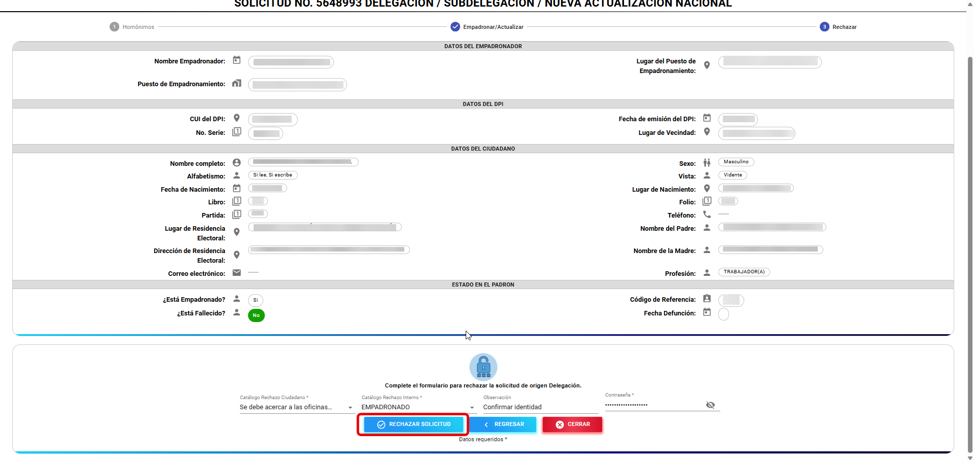 En caso de que la solicitud no pueda ser procesada, el empadronador debe realizar el rechazo desde la pantalla de verificación de información personal del ciudadano.