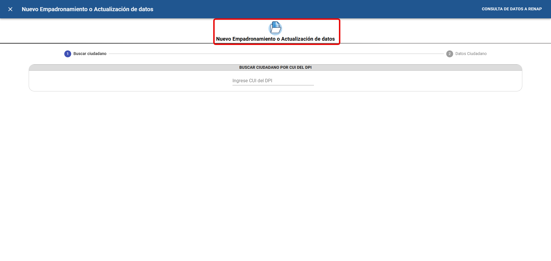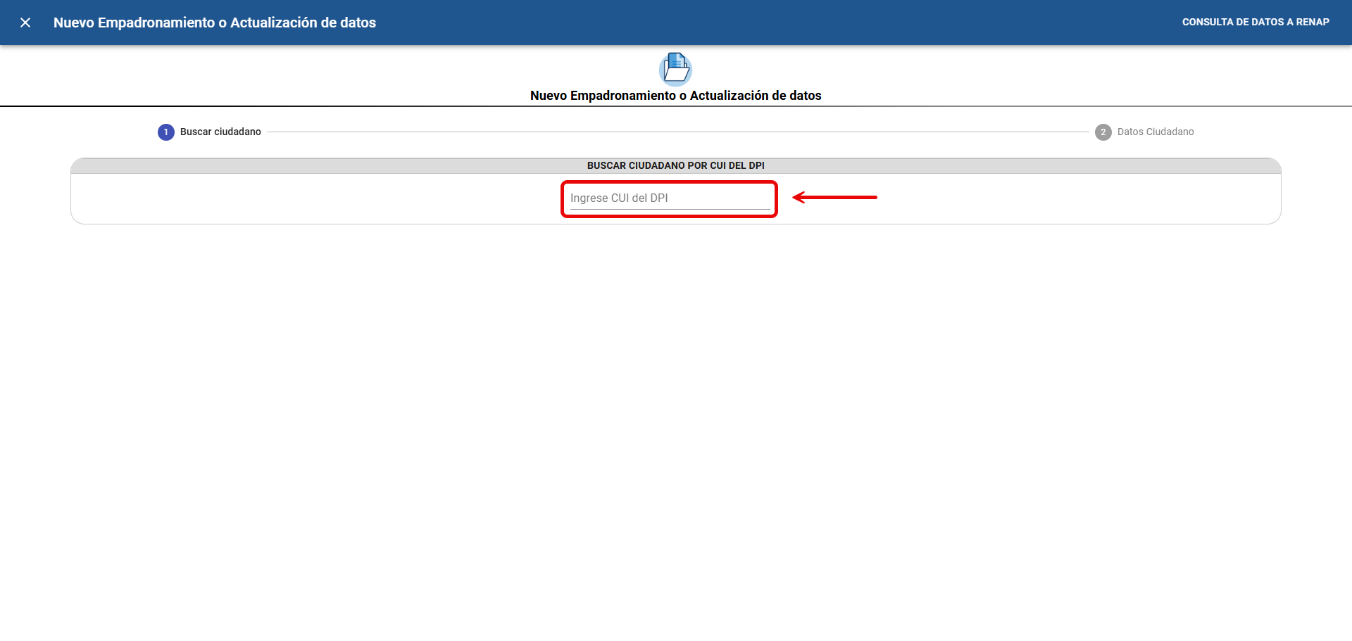 En la siguiente pantalla, ingrese el número de CUI del DPI del ciudadano que desea empadronarse o actualizar sus datos.
