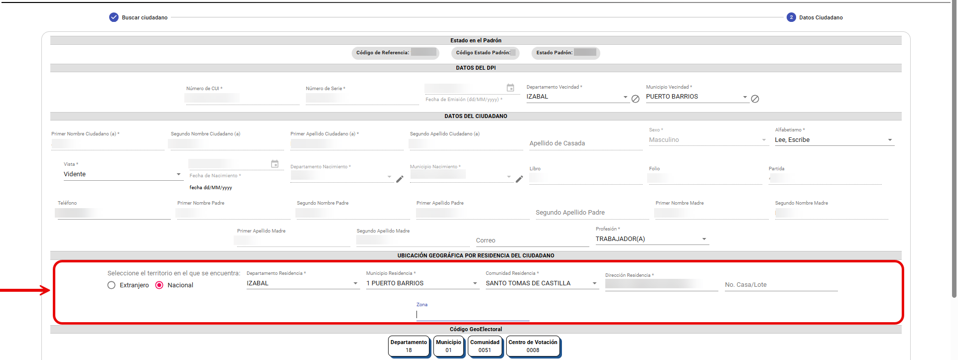 Si el ciudadano reside en territorio nacional, ingrese los siguientes datos: