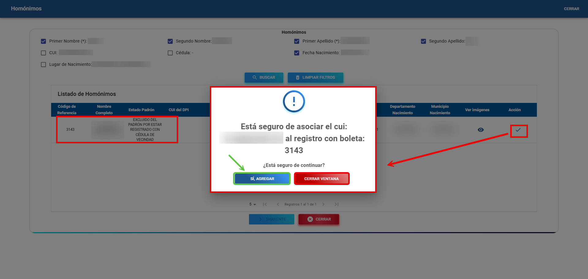 Si durante la búsqueda de homónimos el sistema retorna un registro con estado 16 (excluido del padrón por estar registrado con cédula de vecindad), y el empadronador determina que dicho registro corresponde al ciudadano, puede seleccionarlo para continuar con el proceso.