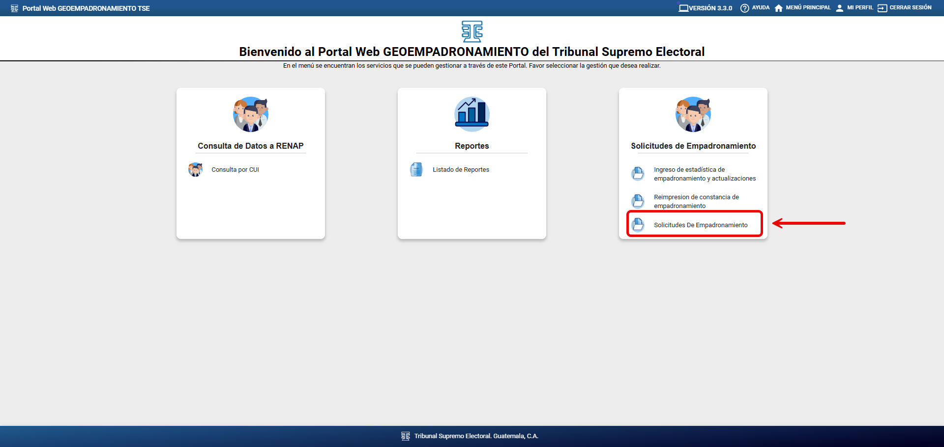 El "Portal Web Geoempadronamiento” tiene como objetivo facilitar a los empadronadores la gestión de las solicitudes de empadronamiento o actualización de datos de los ciudadanos guatemaltecos, tanto residentes en territorio nacional como en el extranjero
