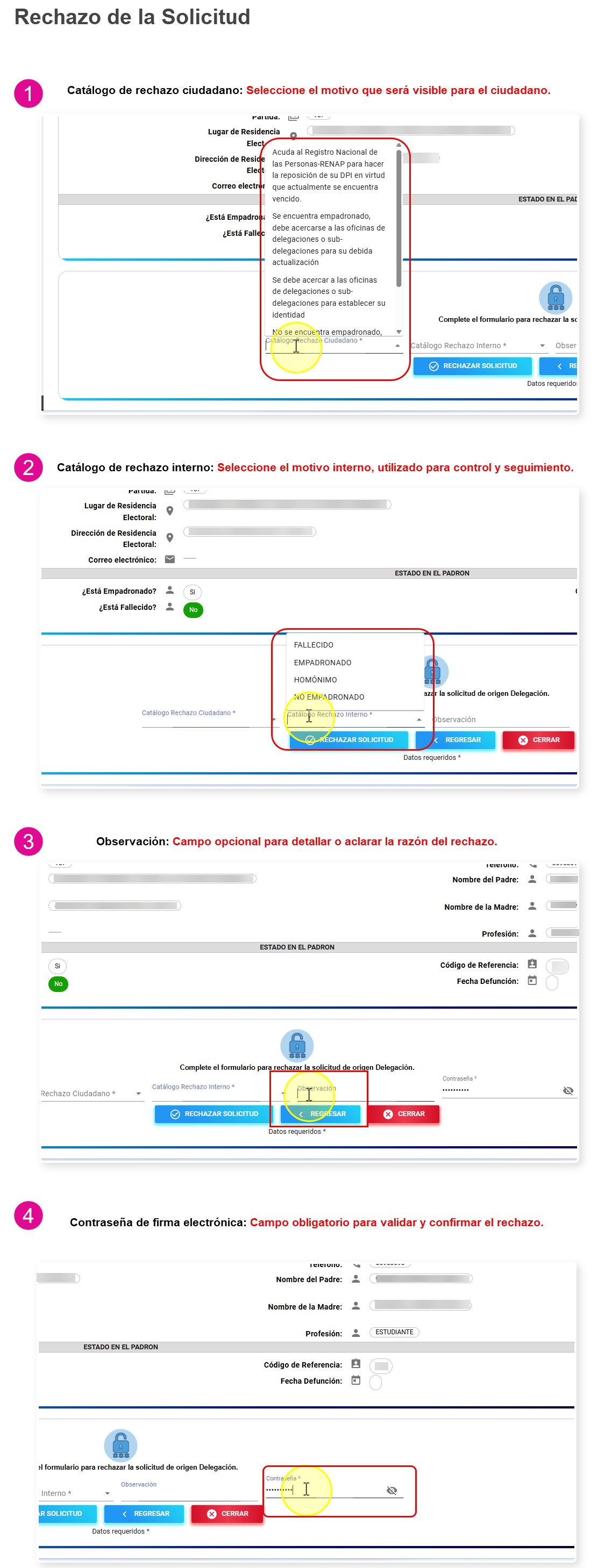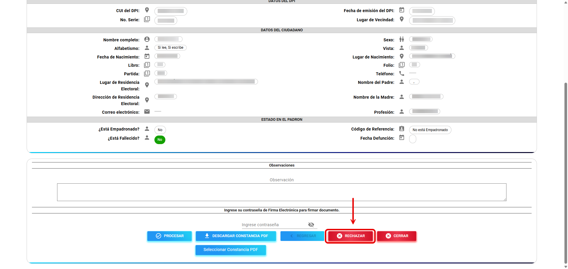 Una vez completados los campos requeridos para el rechazo —Catálogo Rechazo Ciudadano, Catálogo Rechazo Interno, Observación y Contraseña—, el empadronador debe revisar que la información ingresada sea correcta.