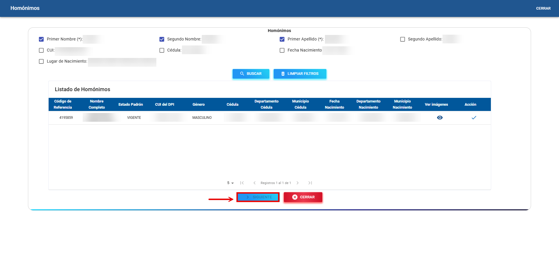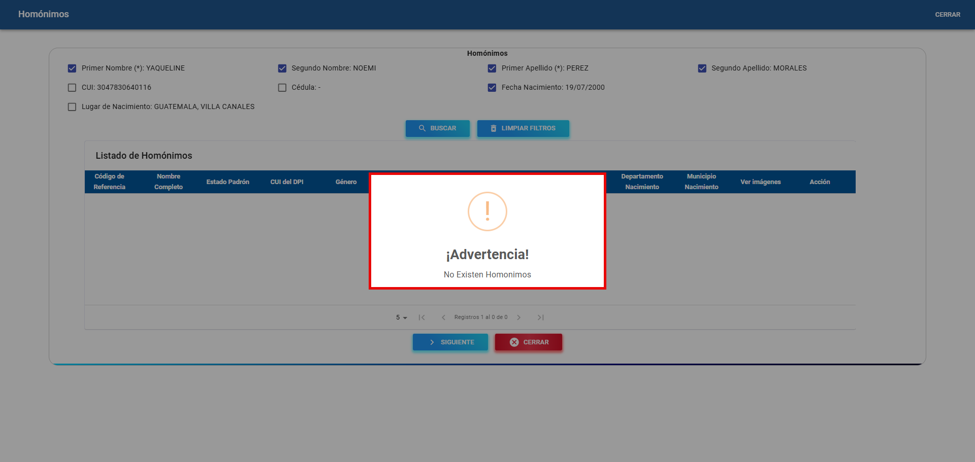 Una vez que seleccione el botón “Siguiente”, el sistema realizará automáticamente una búsqueda de posibles homónimos, utilizando los siguientes filtros predeterminados: