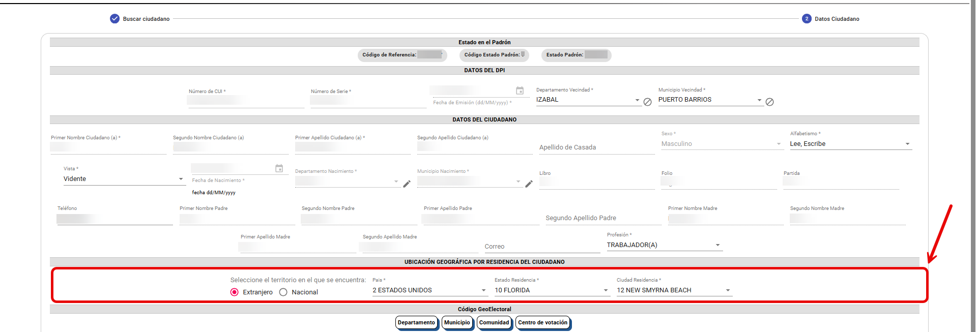 A continuación, ingrese la ubicación geográfica de residencia del ciudadano: