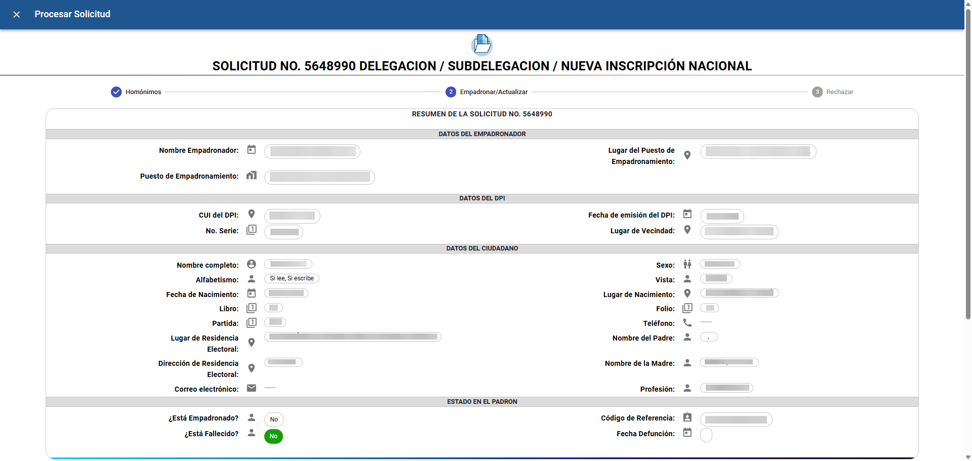 Formulario de Procesado de Solicitud: Formulario que permite verificar la información generada en una solicitud de empadronamiento o actualización de datos y procesarla para dar por terminado el proceso.