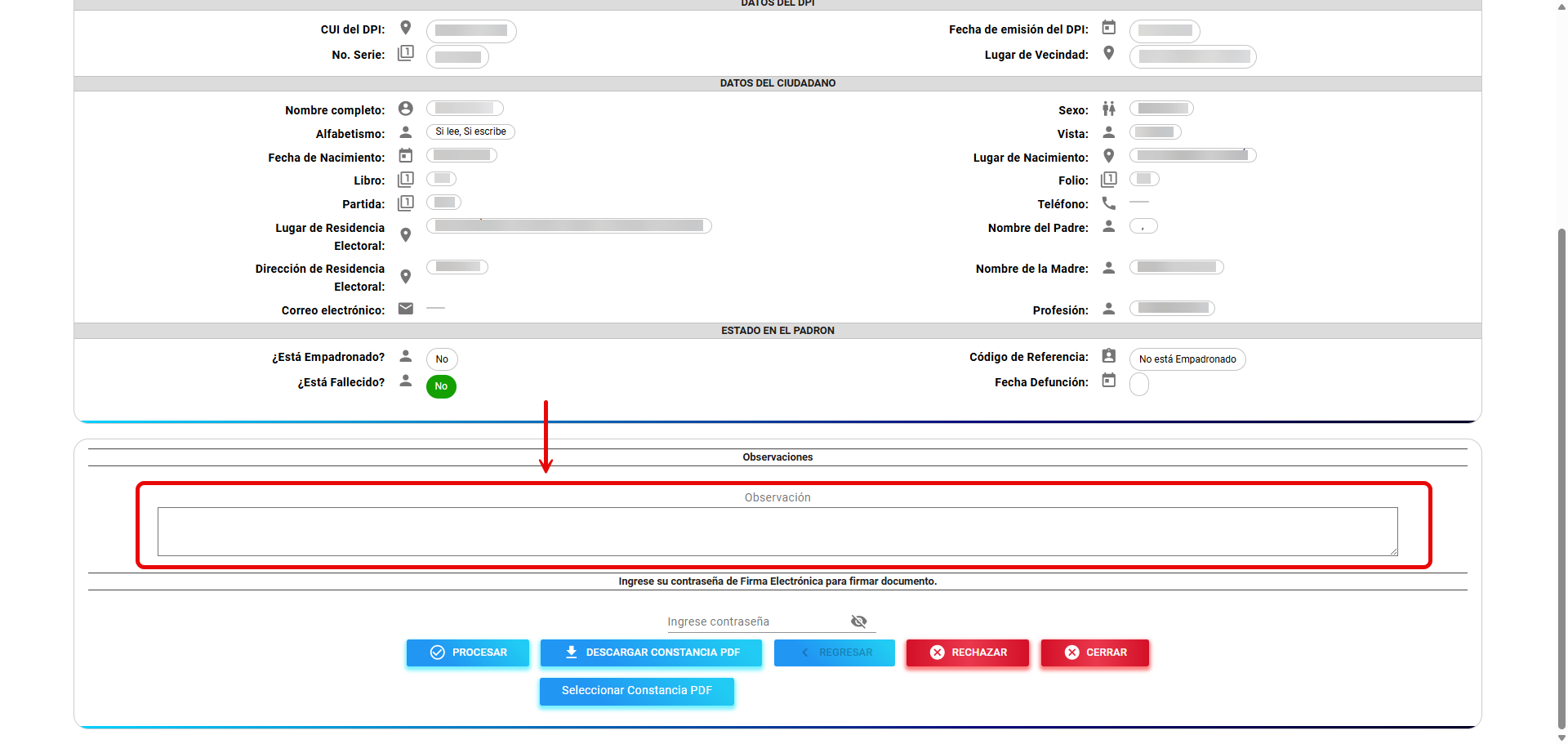 Para finalizar la gestión de la solicitud, el empadronador debe ingresar su contraseña personal de firma electrónica en el campo correspondiente.