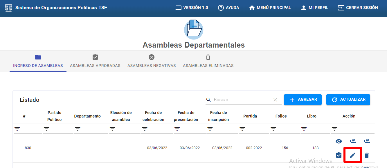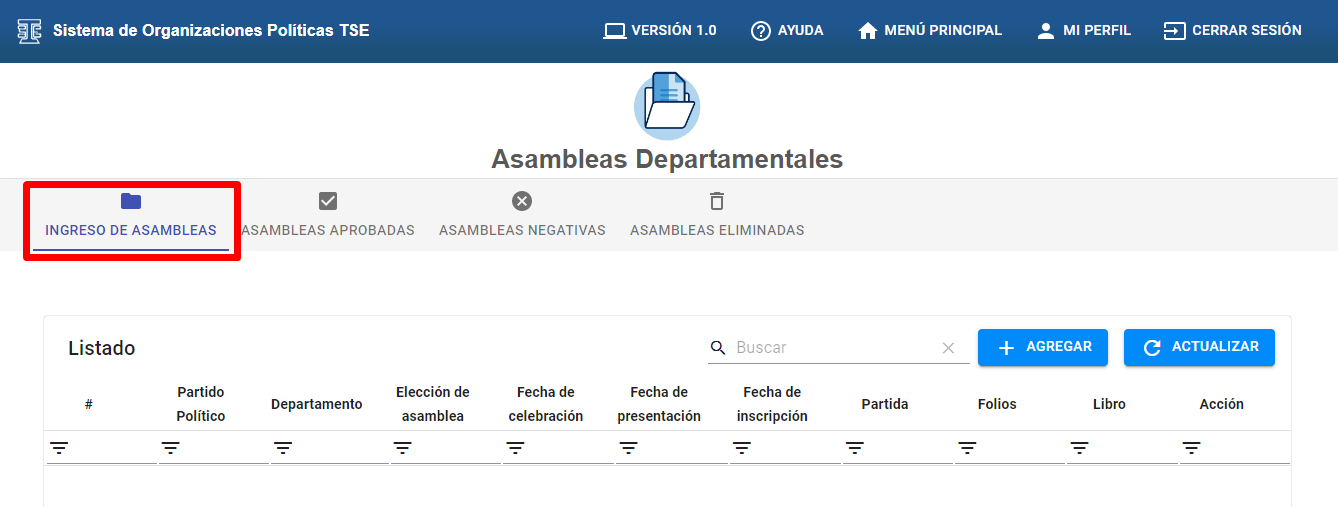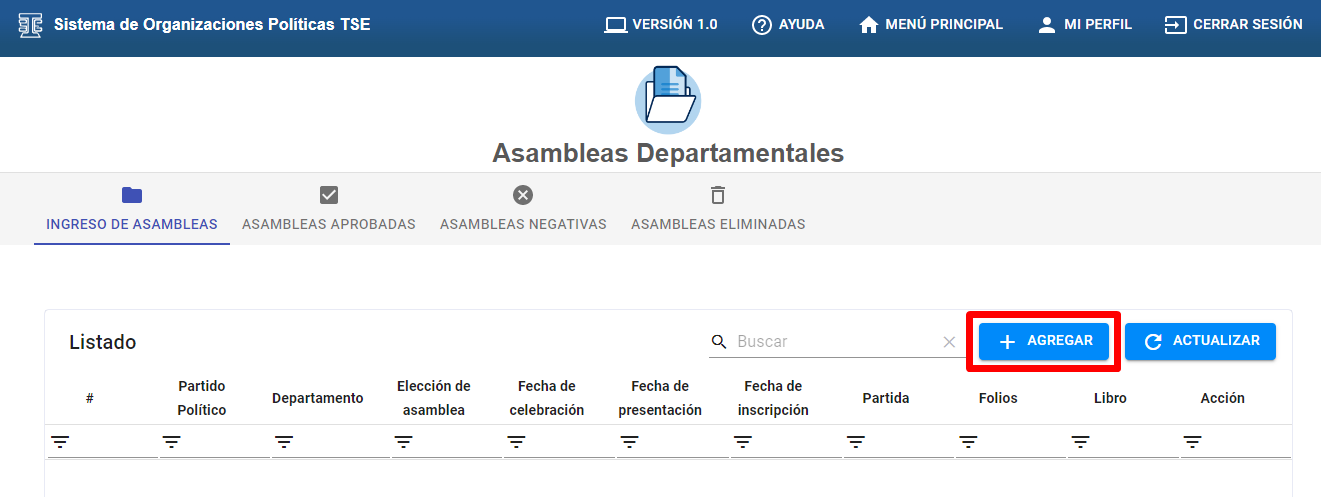 A). Hacer clic en el botón “+AGREGAR” para generar una nueva asamblea departamental