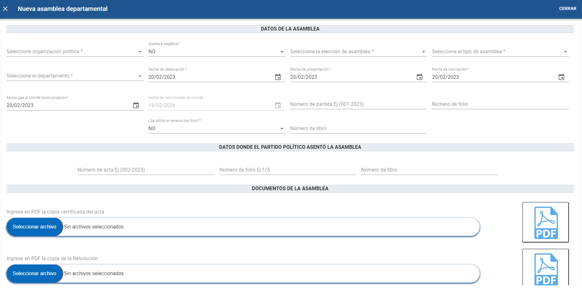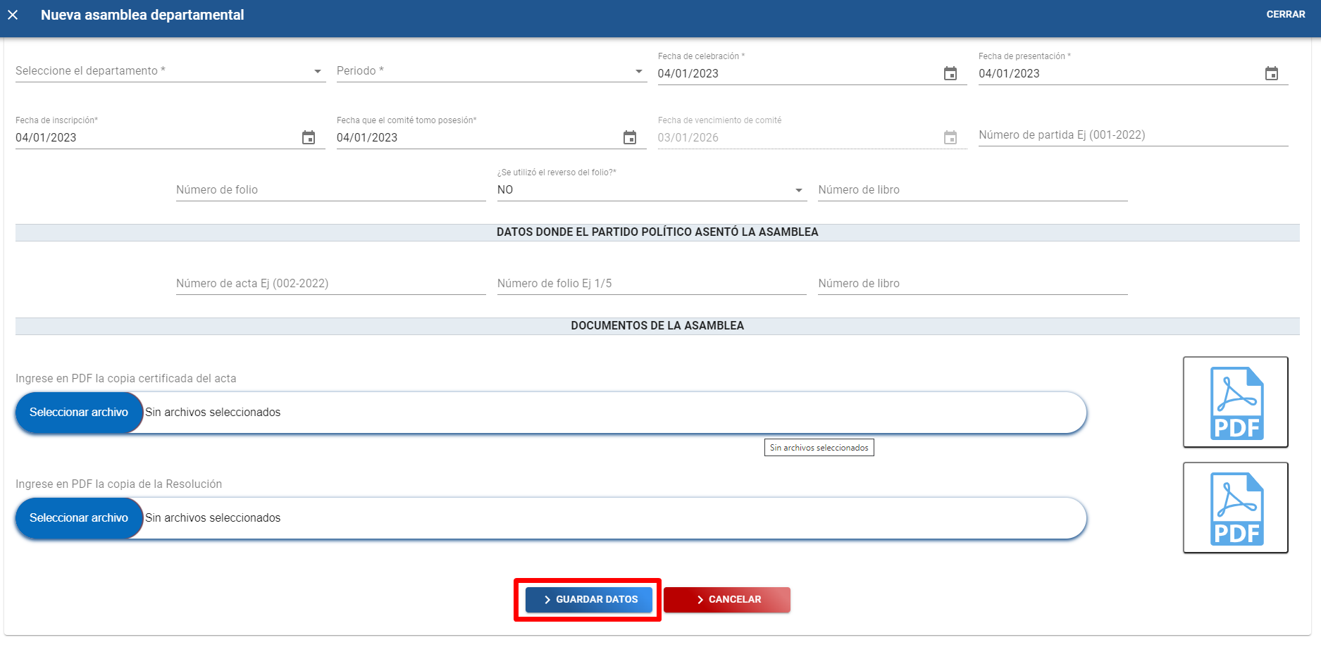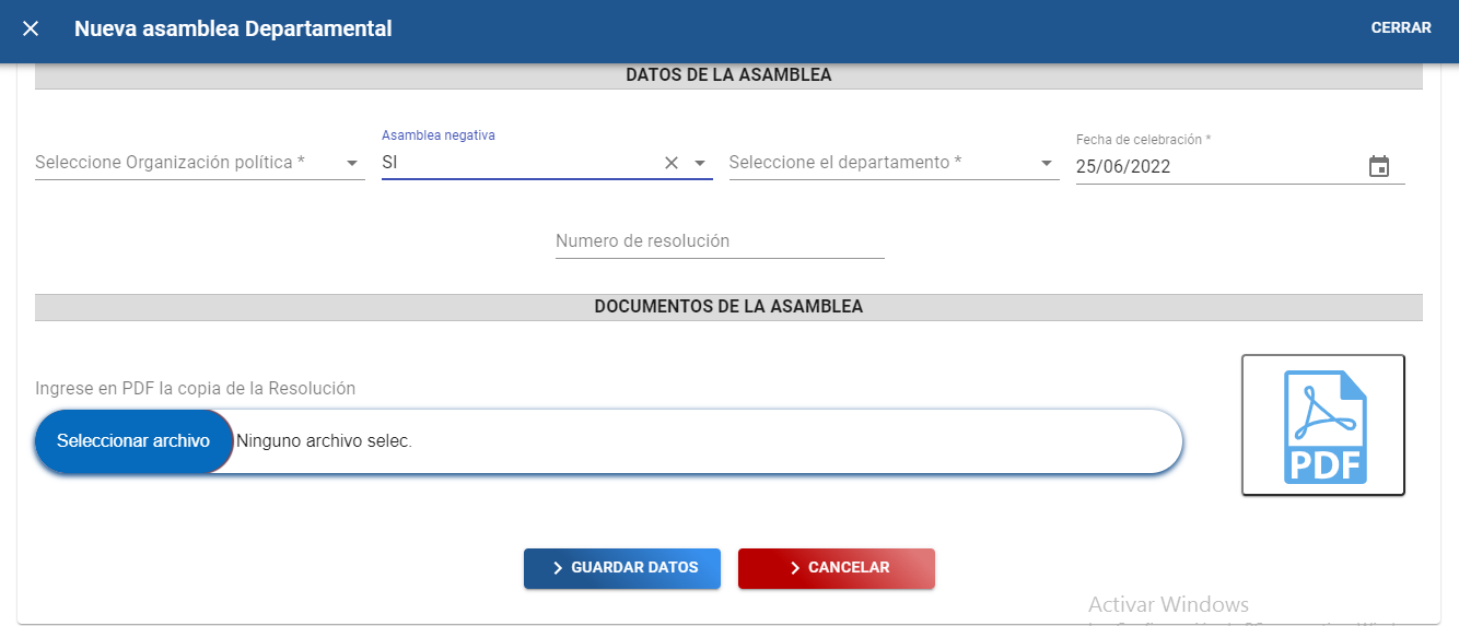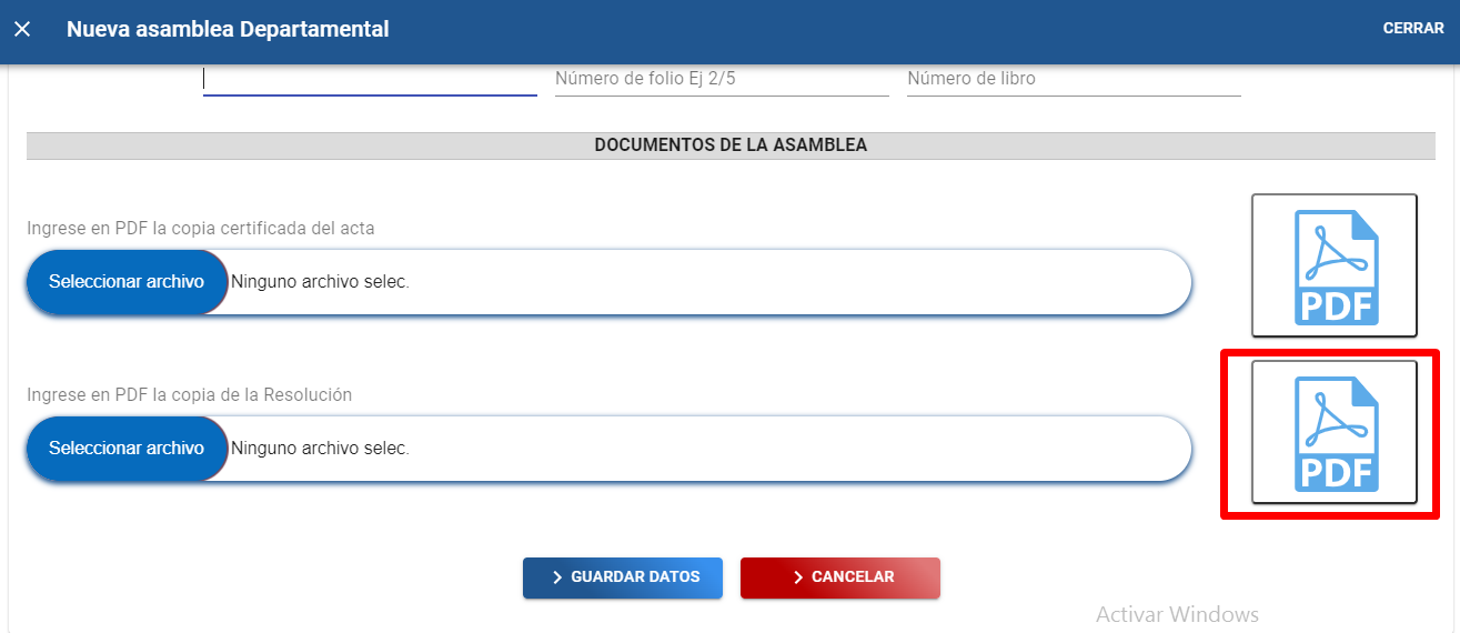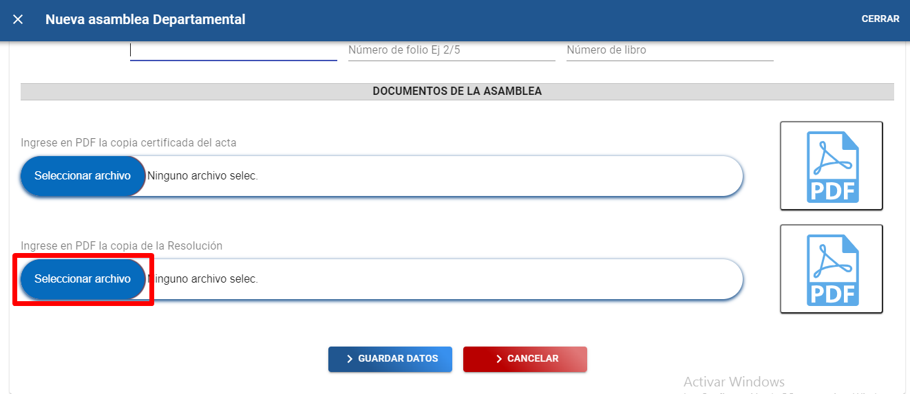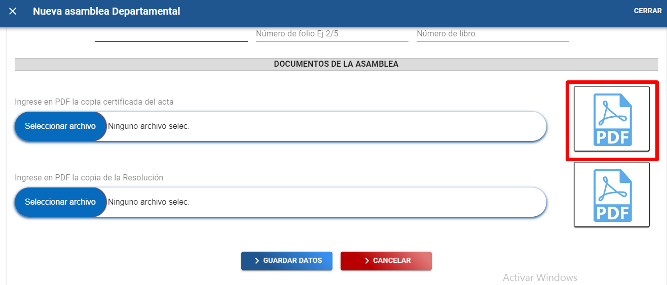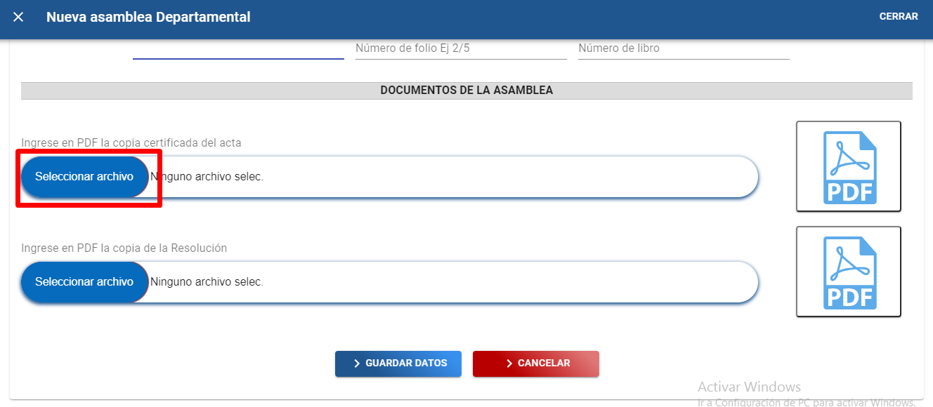 C). Dar clic en el botón “Seleccionar archivo” para adjuntar copia certificada del acta de la asamblea departamental en formato PDF