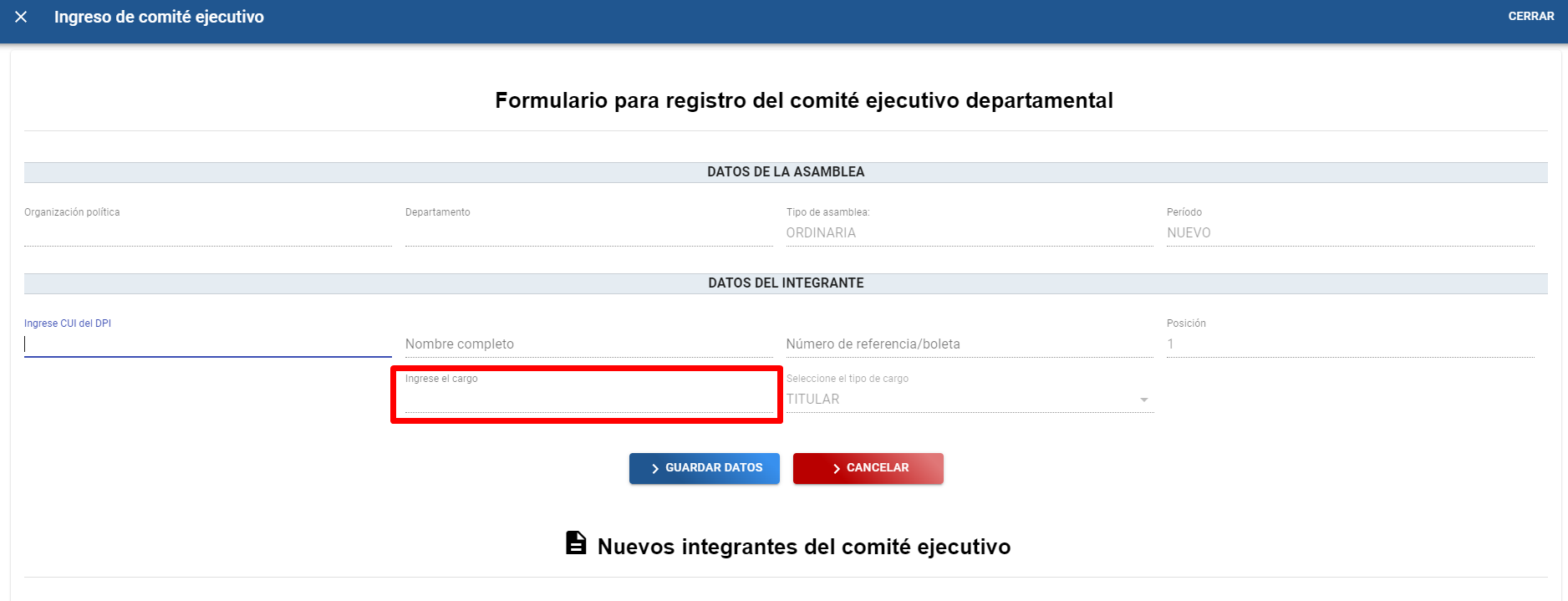 C). El sistema asigna de forma automática el nombre del cargo en la posición 1 y posición 2 en el campo “Ingrese el cargo”, a partir de la posición 3 el usuario deberá de ingresar el nombre del cargo y elegir el tipo de cargo que es “TITULAR” o “SUPLENTE”, después de llenar todos los campos requeridos se procede a guardar dando clic en el botón “GUARDAR DATOS” y la tabla que se encuentra en la parte inferior se va autocompletar en función de los miembros que se guarden.