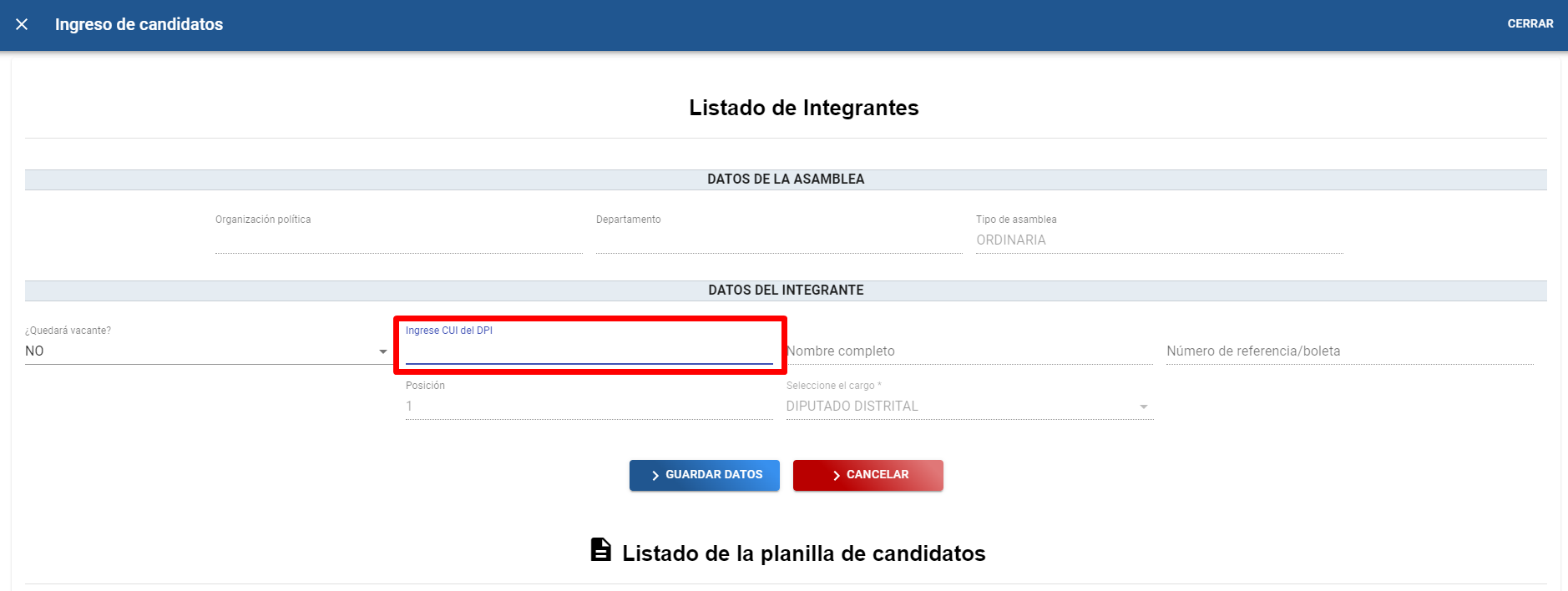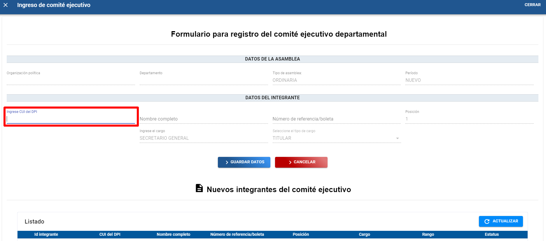 A). Se muestra una pantalla con formulario llamando "Listado de integrantes” en donde se debe ingresar el numero de CUI del DPI en el campo “Ingrese CUI del DPI” después presionar “Enter” para que el sistema haga la búsqueda en el padrón electoral y se autocompleten los campos de “Nombre Completo” y “Número de empadronamiento”