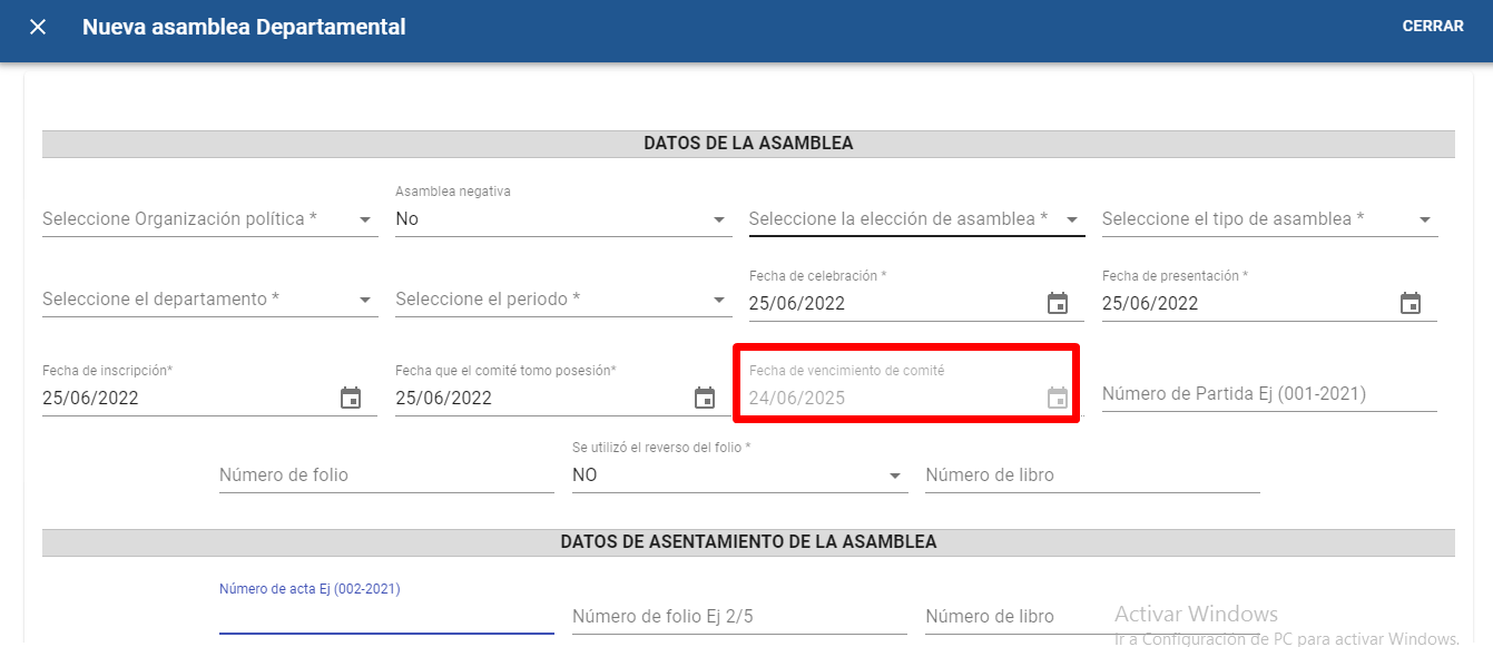 El campo “Fecha de vencimiento del comité ejecutivo” se da automáticamente en referencia al campo “Fecha de celebración”, el cálculo lo hace tres años después del ingreso de la fecha de celebración de la asamblea ordinaria.