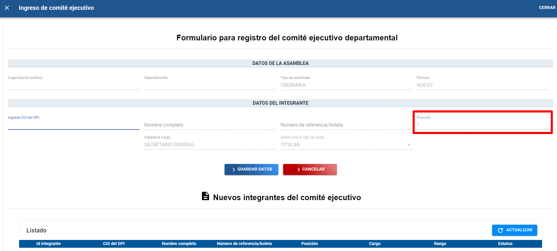 F). Se debe ingresar el numero de posición en la que el nuevo miembro del comité ejecutivo departamental se ubicara, (cabe resaltar que la posición en la que se ubicara el nuevo miembro no debe de estar ocupada ya que de ser así el sistema le indicara que la posición se encuentra ocupada), seguidamente se debe de ingresar el cargo y por ultimo se debe seleccionar el tipo de cargo que tendrá (TITULA ó SUPLENTE) posterior a todo esto se guardan los datos para que la persona quede inscrita en el comité ejecutivo departamental