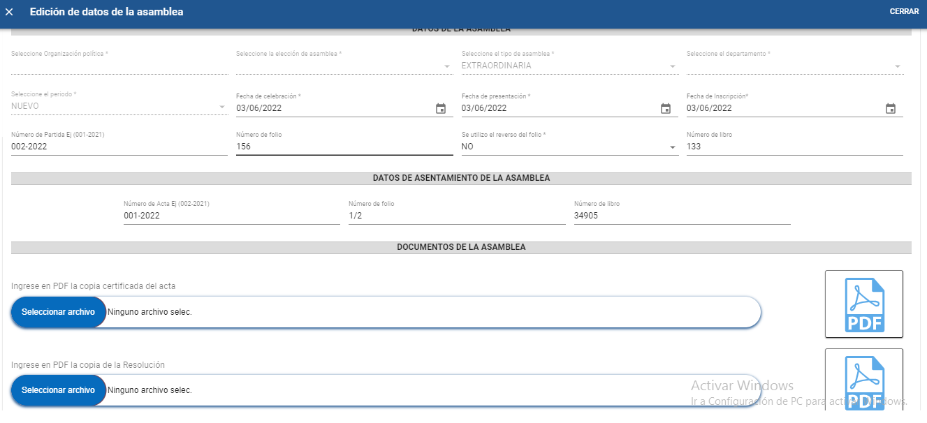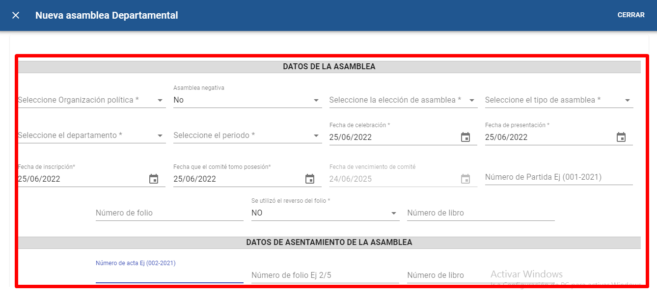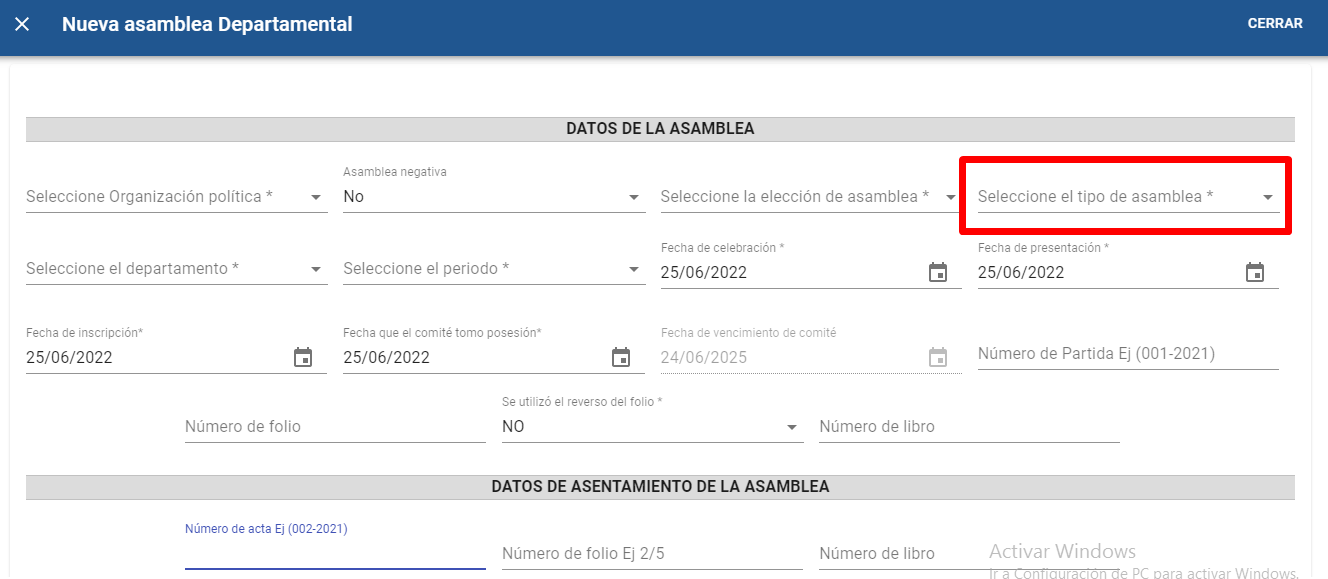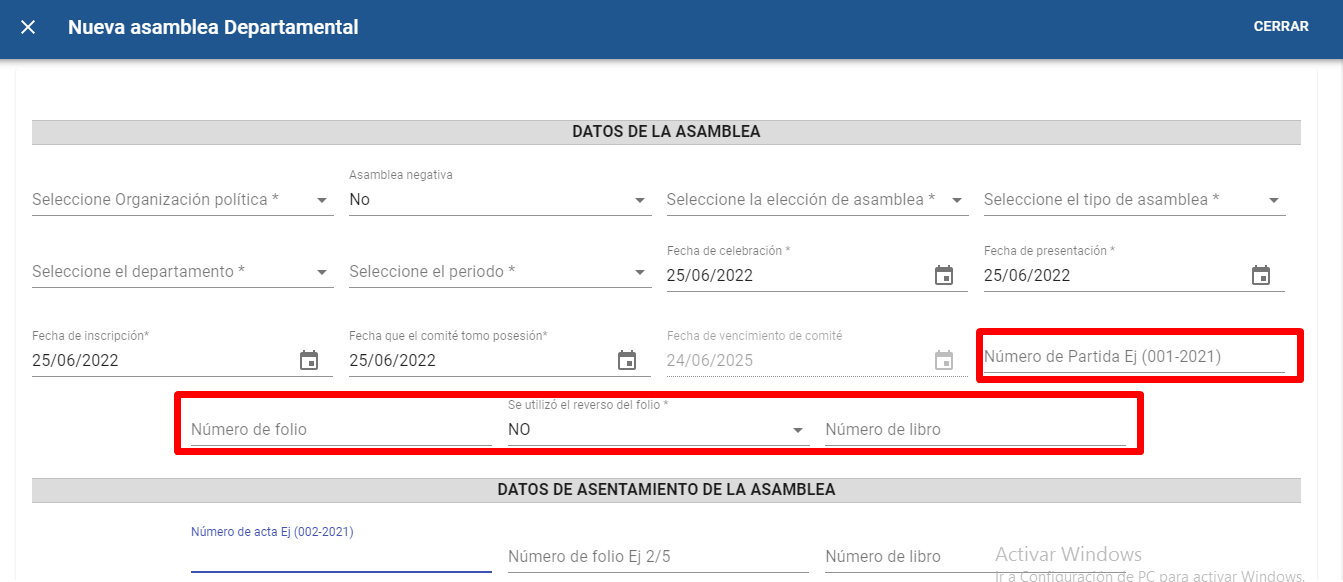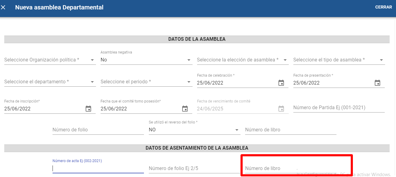 En el campo “Número de libro” que se encuentra en el formulario “DATOS DONDE EL PARTIDO POLITICO ASENTÓ LA ASAMBLEA” el sistema tiene la validación de reconocer el número de libro de asambleas que se le asigno al partido político en ese departamento, si se ingresa un numero incorrecto el sistema no permitirá guardar la asamblea