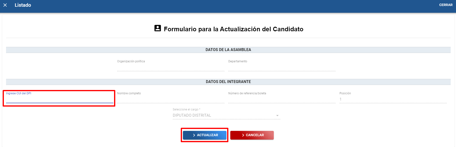 B). Se muestra una pantalla con “Formulario para la actualización de candidatos” en donde se muestra información de la organización política, el nombre del cargo, número de posición y el campo que se puede editar “Número del DPI” en donde se ingresa el número de CUI de la nueva persona que ocupara la posición indicada, se presiona “Enter” para traer la información del padrón electoral y se da clic en el botón “Actualizar datos”.