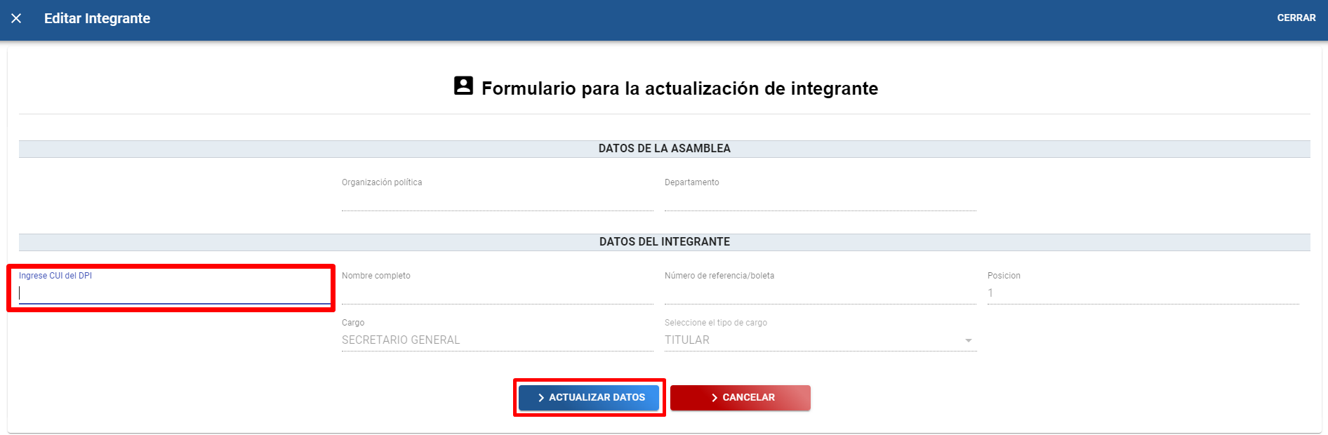 B). Se muestra una pantalla con “Formulario para actualización del integrante” en donde se muestra información de la organización política, el nombre del cargo, número de posición y el campo que se puede editar “Número del DPI” en donde se ingresa el número de CUI de la nueva persona que ocupara la posición indicada, se presiona “Enter” para traer la información del padrón electoral y se da clic en el botón “Actualizar datos” para guardar la información.