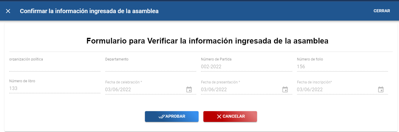 B). Se muestra pantalla con “Formulario para confirmar la información ingresada de la asamblea” los datos que se muestran en el formulario son únicamente para visualizar en este formulario no se puede editar ningún campo, después de verificar los datos dar click en el botón “APROBAR”. para confirmar la asamblea.