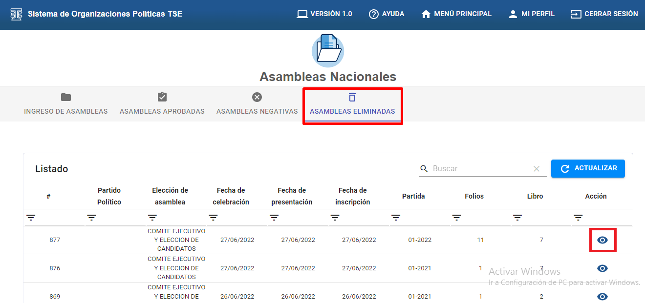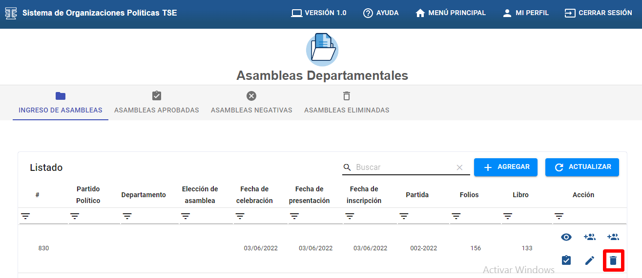 A). Dar clic en el icono “ELIMINAR ASAMBLEA” esta acción es para eliminar la asamblea registrada después de eliminar la asamblea desaparece de la pestaña “INGRESO DE ASAMBLEAS” y pasa a la pestaña “ASAMBLEAS ELIMINADAS”
