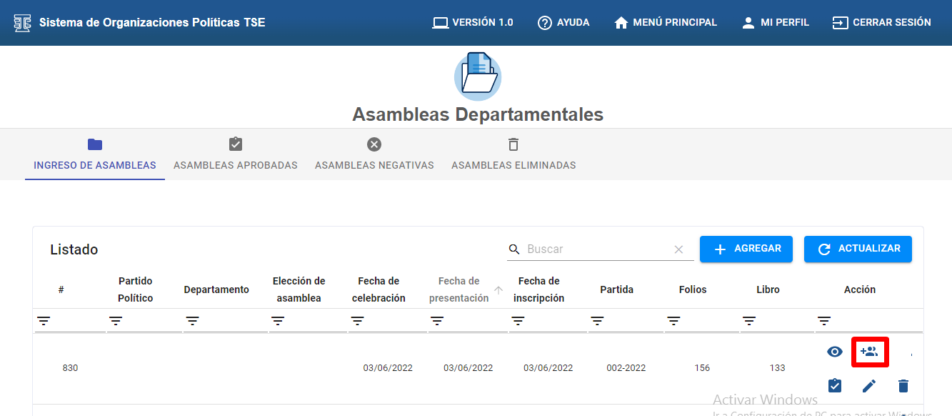 En las opciones que se muestran en la columna “Acción” dar clic en el icono “INGRESAR COMITÉ EJECUTIVO” para iniciar el proceso de registro de miembros del comité ejecutivo departamental.